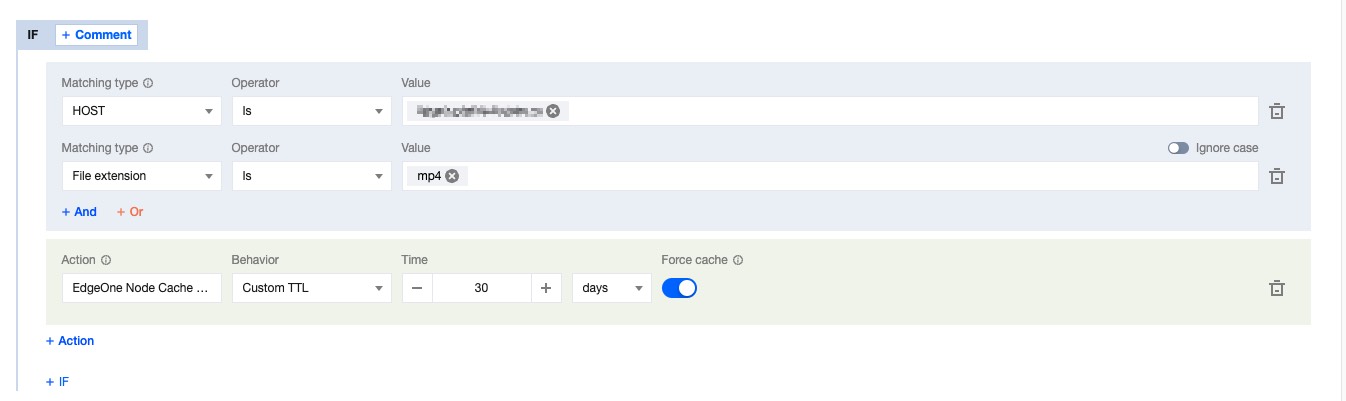 When you view the resource hit rate in the cache analysis, you can view the specific file extensions on the right to see which types of resources have a large number of misses. For example, in the current cache distribution, there are many .mp4 format files that have not hit the cache. If you follow EdgeOne's default caching rules completely, the problem is that the response file failed to respond to the Cache-Control header. According to the default caching rules, the .mp4 file has a cache time of 2 hours on the node. Because the cache time is short, this file will frequently go back to the origin. If you need to cache this file, you can go to the rule engine, add a new rule, set the node cache TTL to custom cache for 30 days when the file extension is equal to mp4, and enable forced caching, that is, ignoring the CC header of the origin response, and the node forcibly caches the file. For detailed operation steps, please refer to: Node cache TTL. 2. Customize the cache key Cache Key to point the same type of request to a cache file