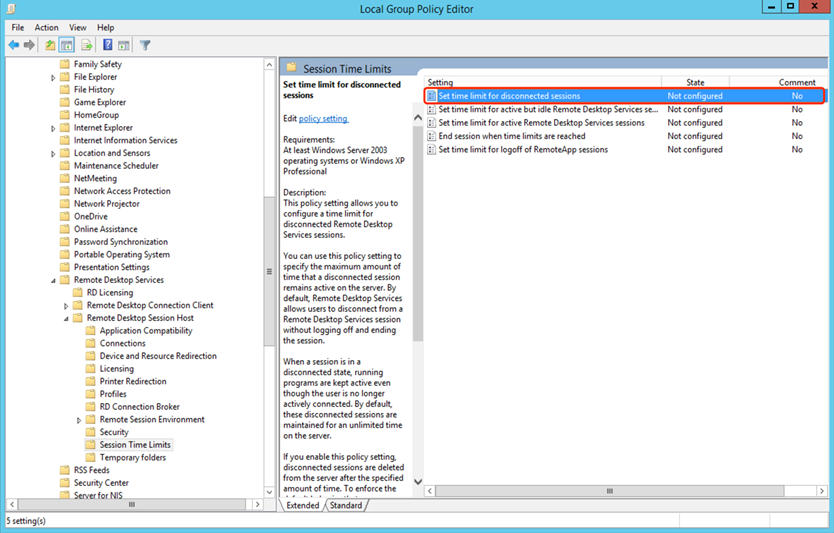 4. Select Computer Configuration > Administrative Templates > Windows Components > Remote Desktop Services > Remote Desktop Session Host > Session Time Limit, and modify the configuration: Note: