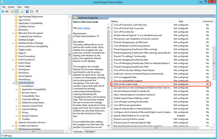 5. Select Computer Configuration - Manage Template - Windows Components - Internet Explorer Settings, modify the configuration to enable the Force Full Screen Mode setting.