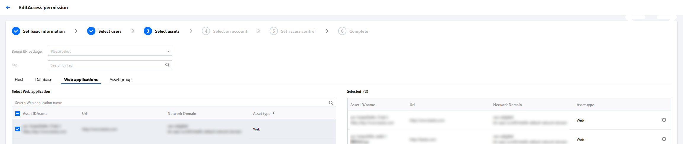 4. Change the asset custody status added in step 3 to Bound. 5. On the Access Permission page, authorize the web application assets added by the operation and maintenance personnel. 6. Switch to maintenance mode or log in to the Operations Console, select Web Application Assets, and click access the corresponding asset.