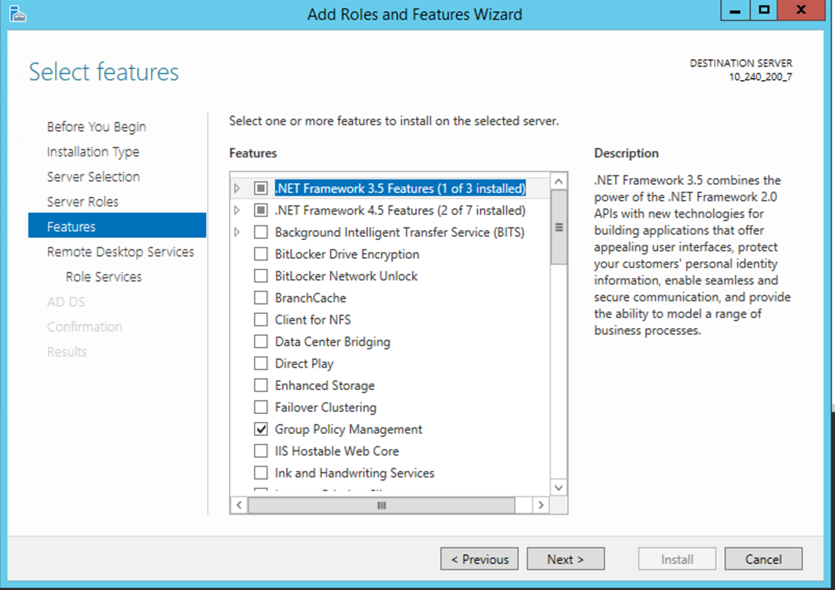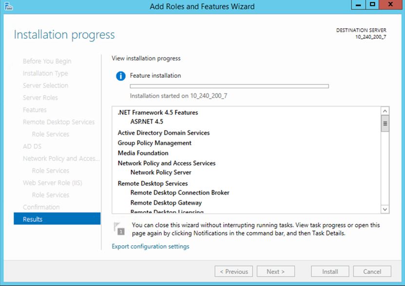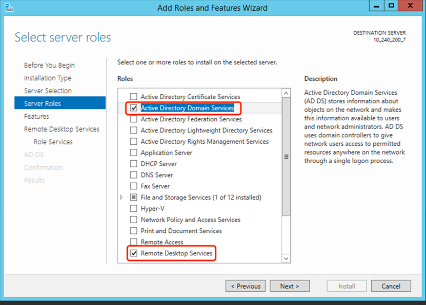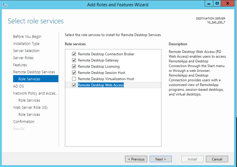 3. On the Add Roles and Features Wizard page, click Next to the installation type, select Role-based or Feature-based Installation, and click Next. 4. Select the currently used server, and click Next. 5. On the Server Roles page, select the roles: Active Directory Domain Services, Remote Desktop Services. Click Next. 6. (Optional) Select additional features as needed. 7. For the next step of the remote desktop service, on the Select Role Services page, check: Remote Desktop Web Access, Remote Desktop Session Host, Remote Desktop Connection Broker, Remote Desktop Licensing, Remote Desktop Gateway. Click Next.