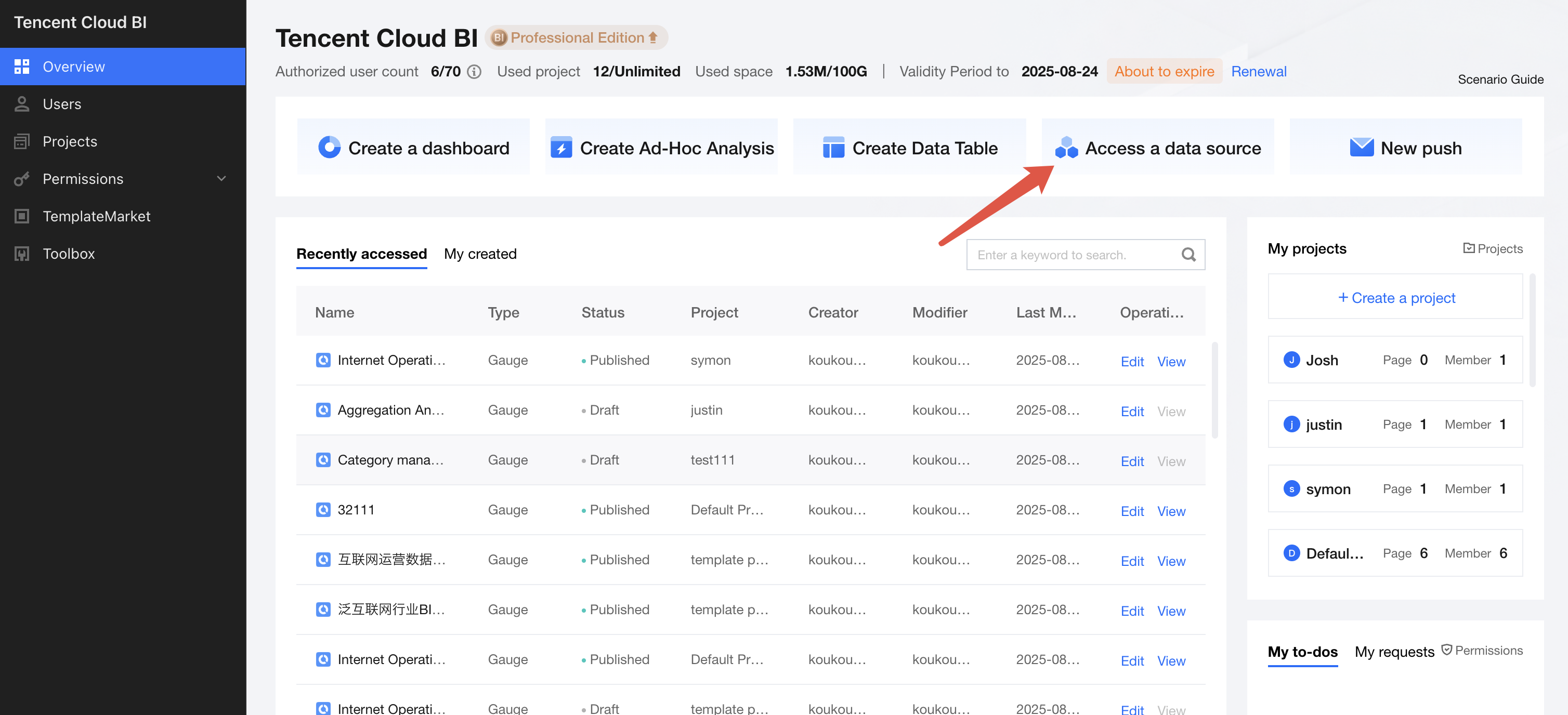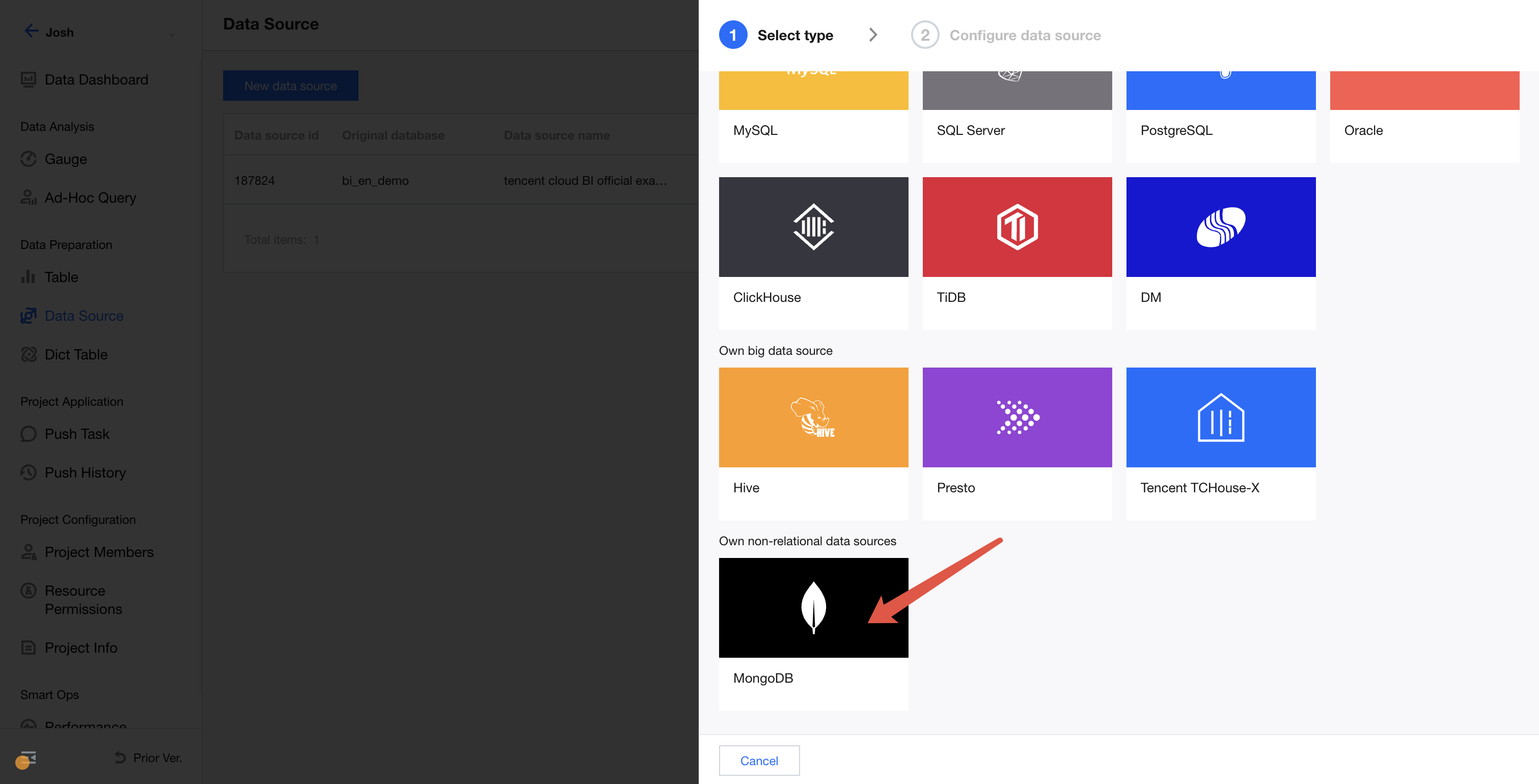 Log in to the BI Console and select "Access Data Source". After selecting the corresponding project, select "MongoDB" under proprietary data sources.