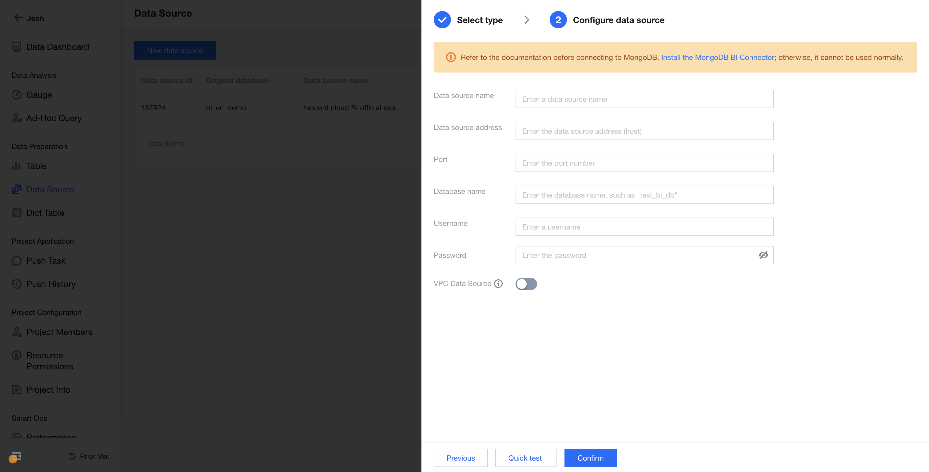 After the MongoDB Connector is installed, you can create a MongoDB data source in the BI console. The specific process is as follows: