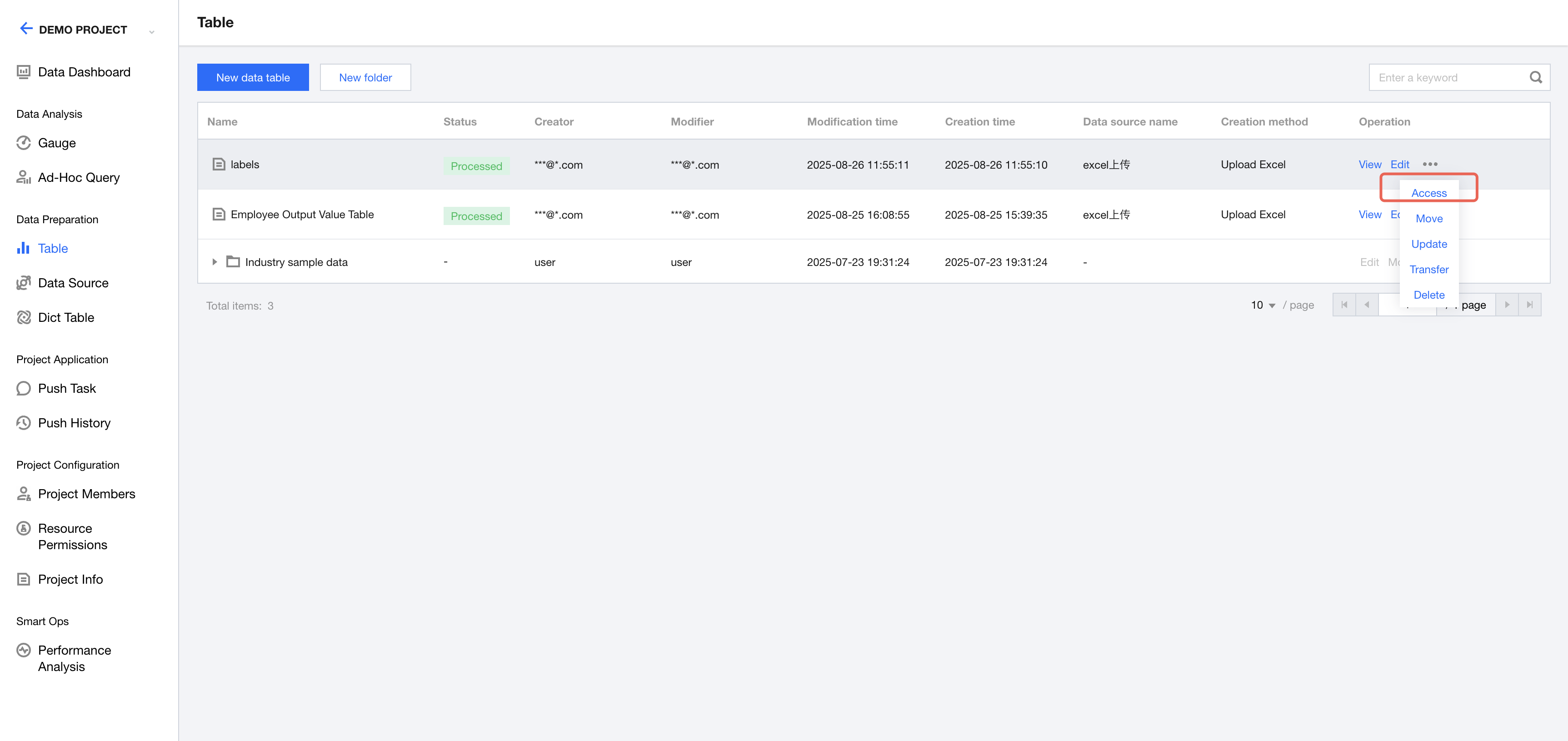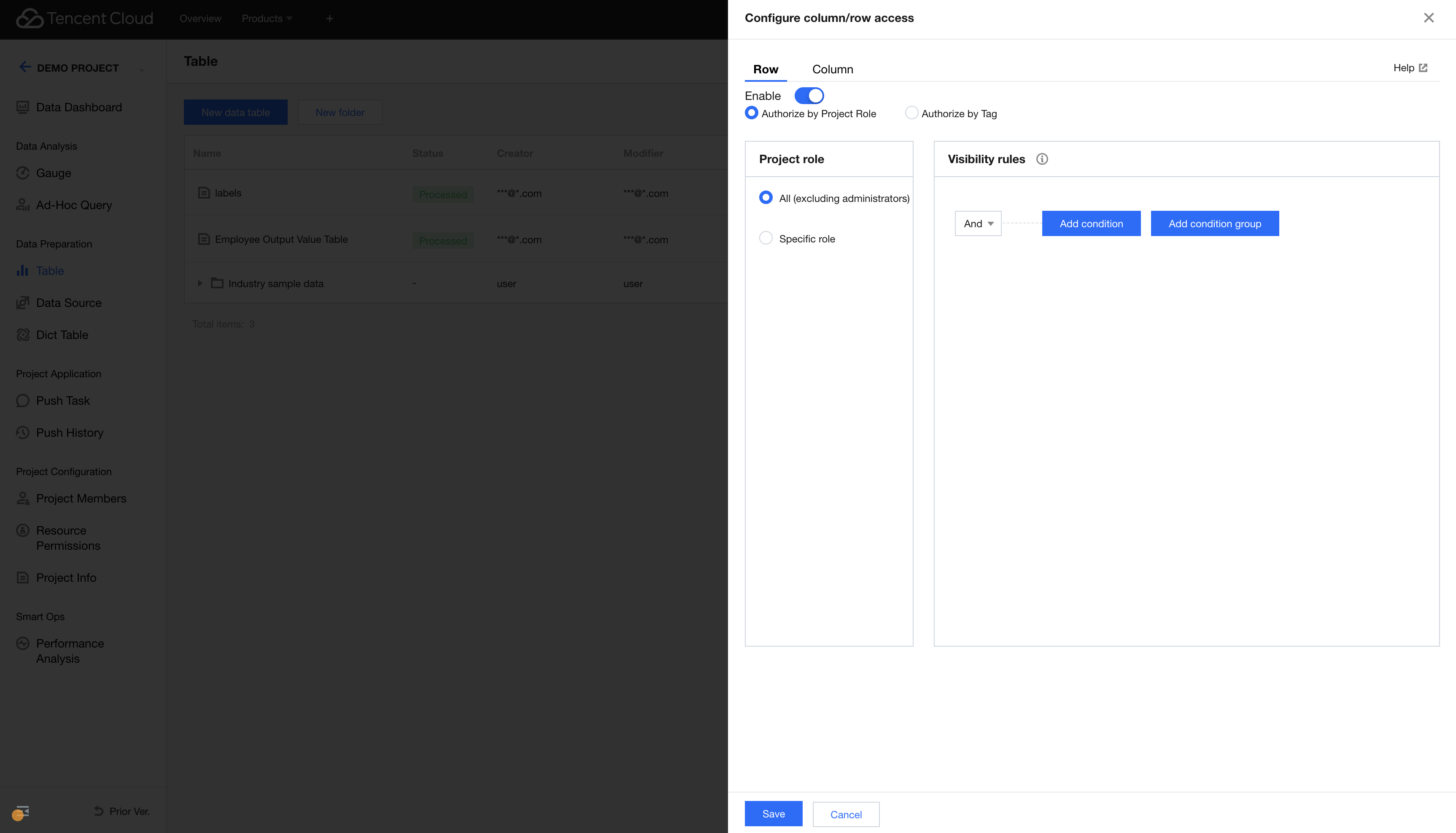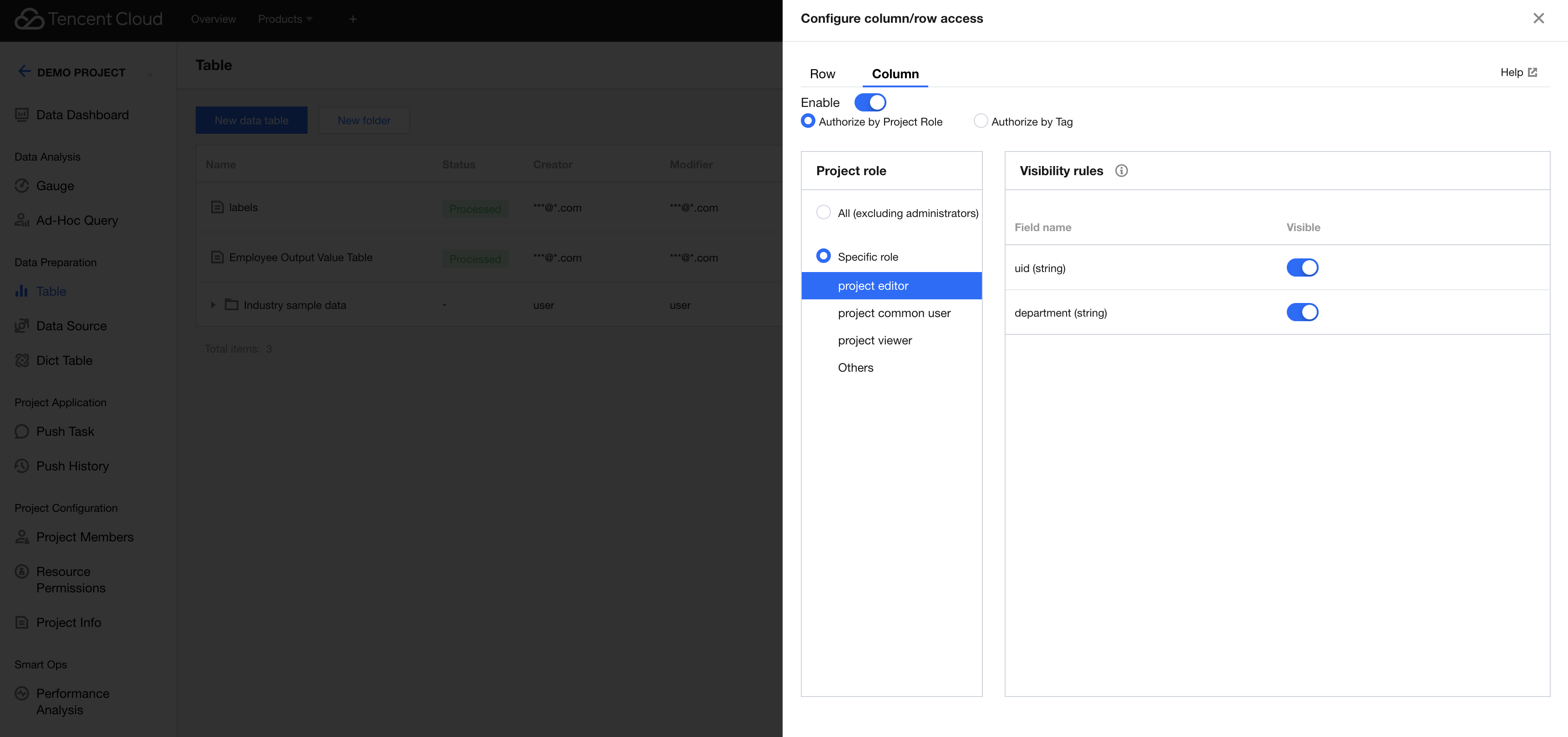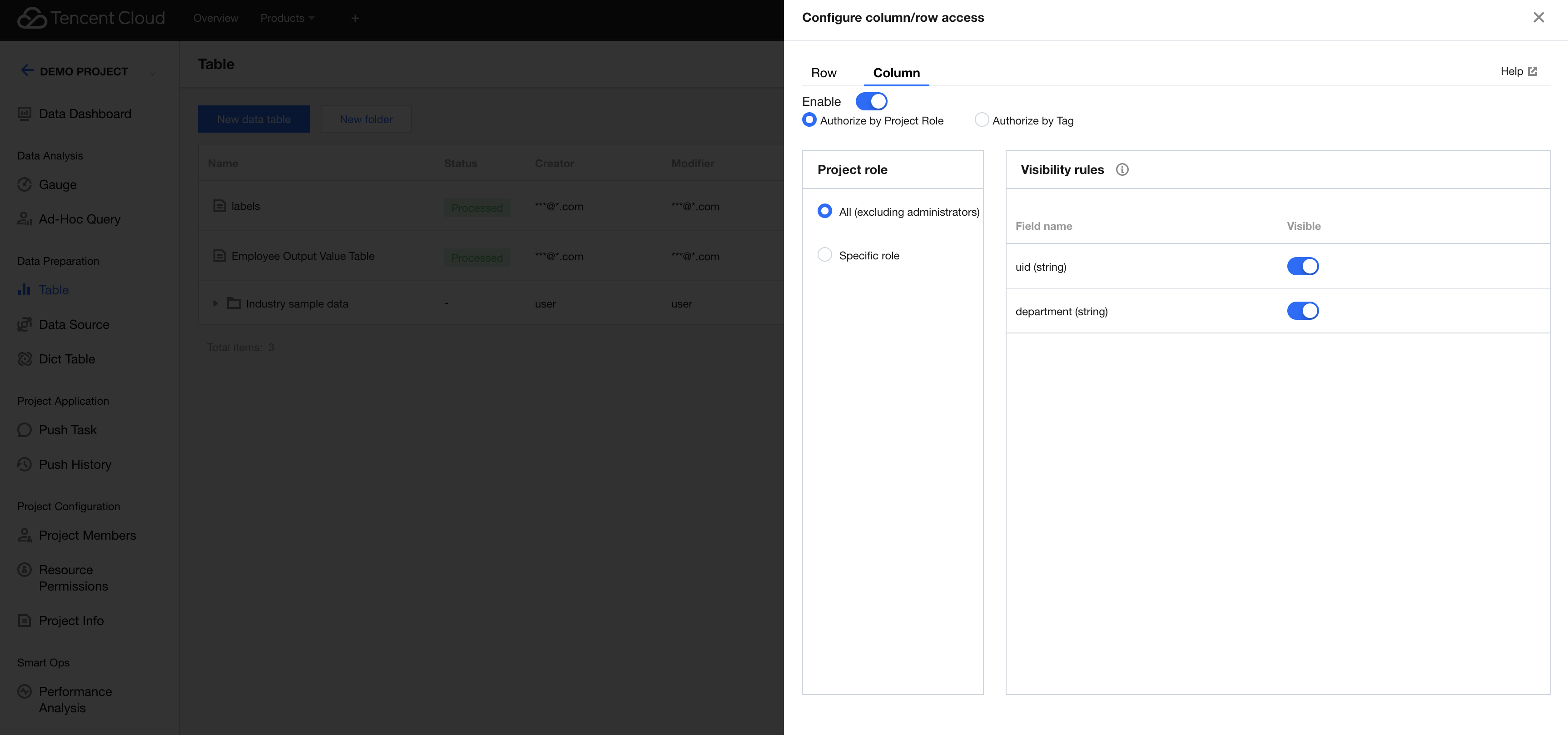 1. Enter the project management module, go to the corresponding project data Tab, and select "Row/Column Permissions" from the right-side operation of the corresponding data table. A drawer will pop up. 2. In the row and column permission configuration drawer > row-level permissions, you can configure row permissions for the data table. 3. Click the Enable permissions switch to enable or disable the row permissions for the data table.