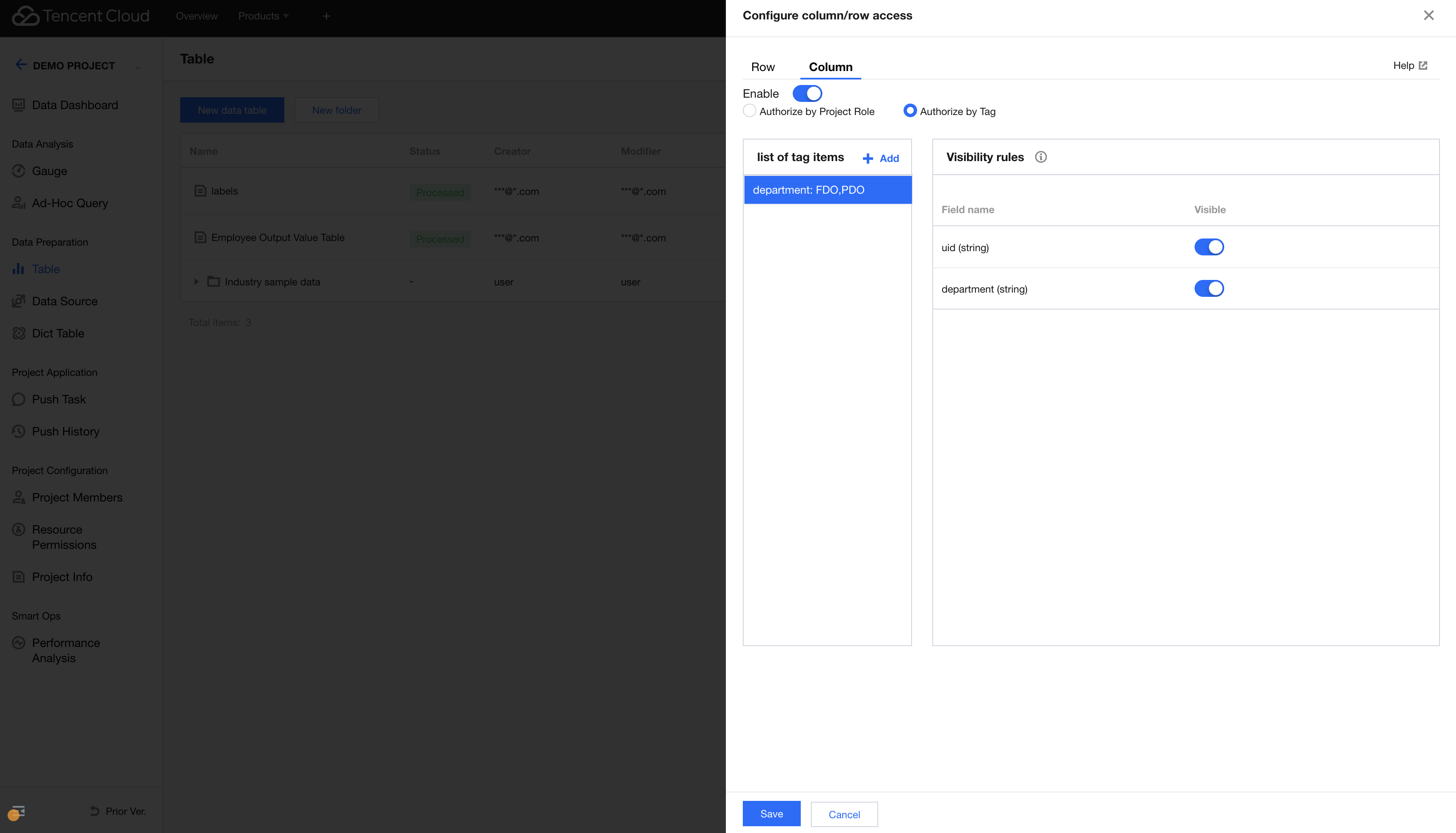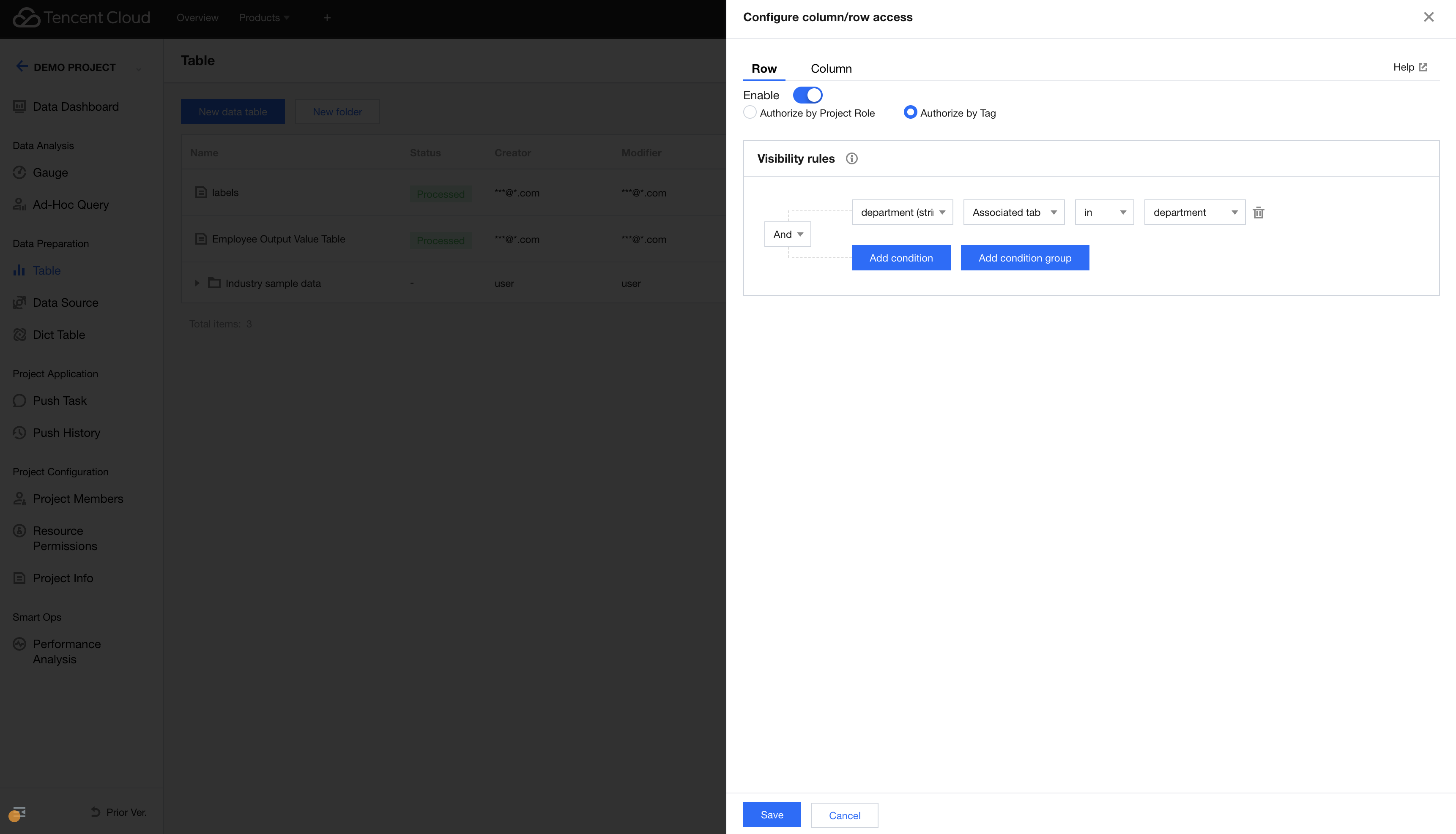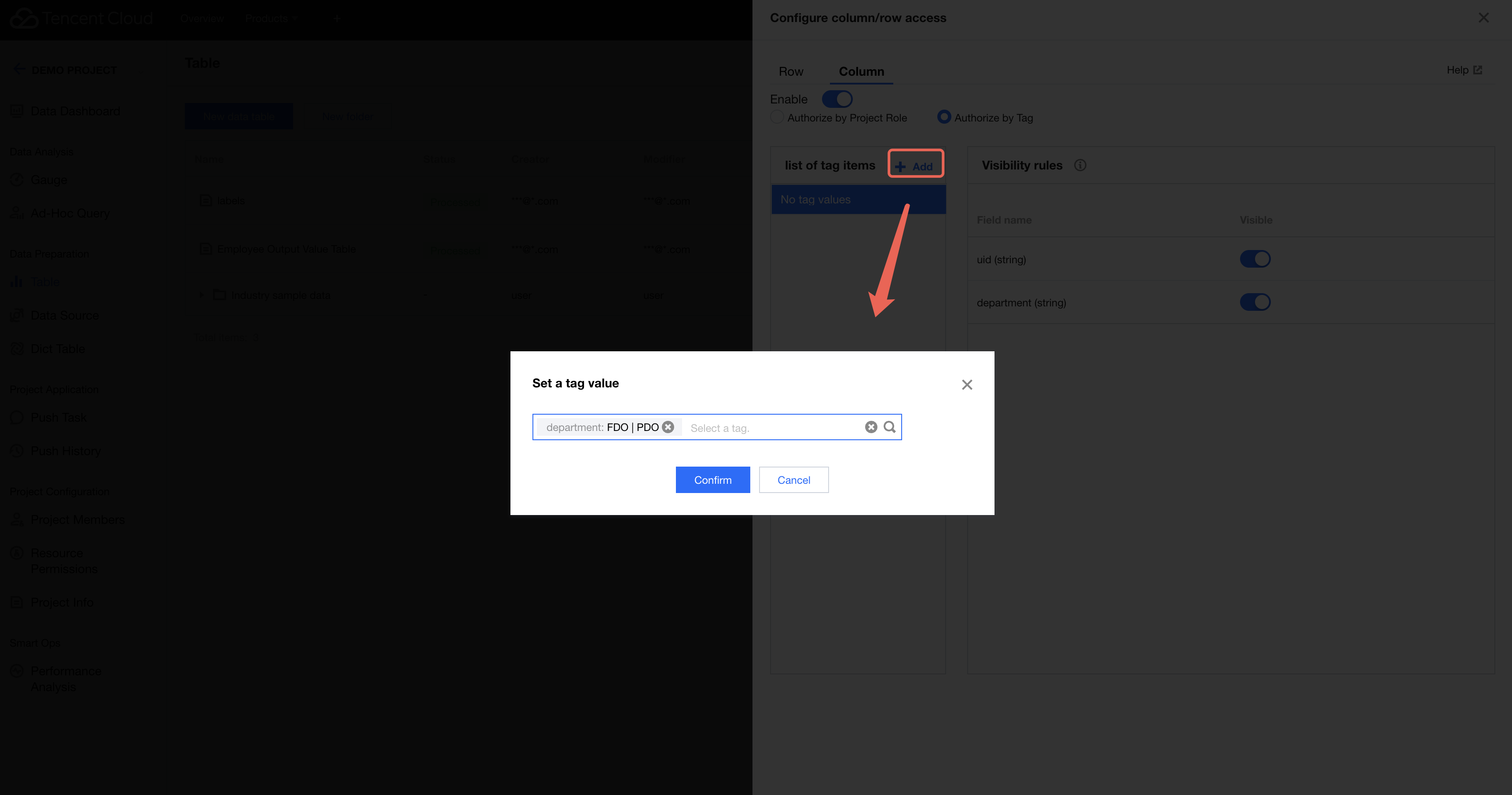 1. Click Add in the tag list. The available tags are created in Tag Management. You can select multiple values for each tag. 2. In the visibility rules section, you can configure the data column permission conditions and enable or disable the permissions to view the corresponding fields (enabled by default).