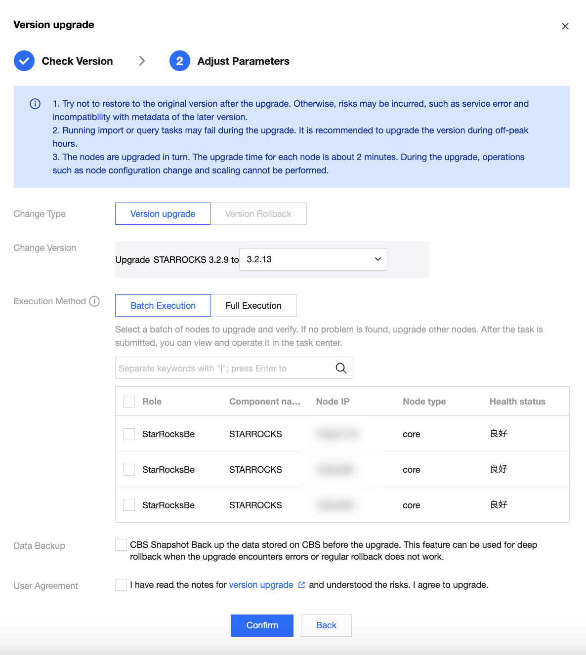 You can back up the data during the upgrade (only supported when all internal table storage media are CBS) to restore the data to the pre-upgrade state if neither software version nor metadata rollback can promptly restore the service. To ensure the consistency of metadata and data, when you choose to back up the data during an upgrade, the StarRocks service will undergo a brief maintenance downtime.