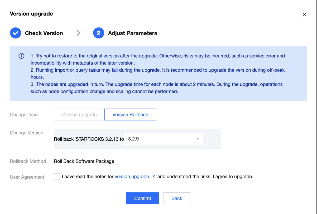 Note: The rollback of "Metadata Meta Directory" and "CBS Snapshots" is only available in the upgrade scenario for the StarRocks component. Rolling back these elements will revert the service's metadata and data to their pre-upgrade states, resulting in the loss of any metadata and data changes made after the upgrade. Please proceed with caution.