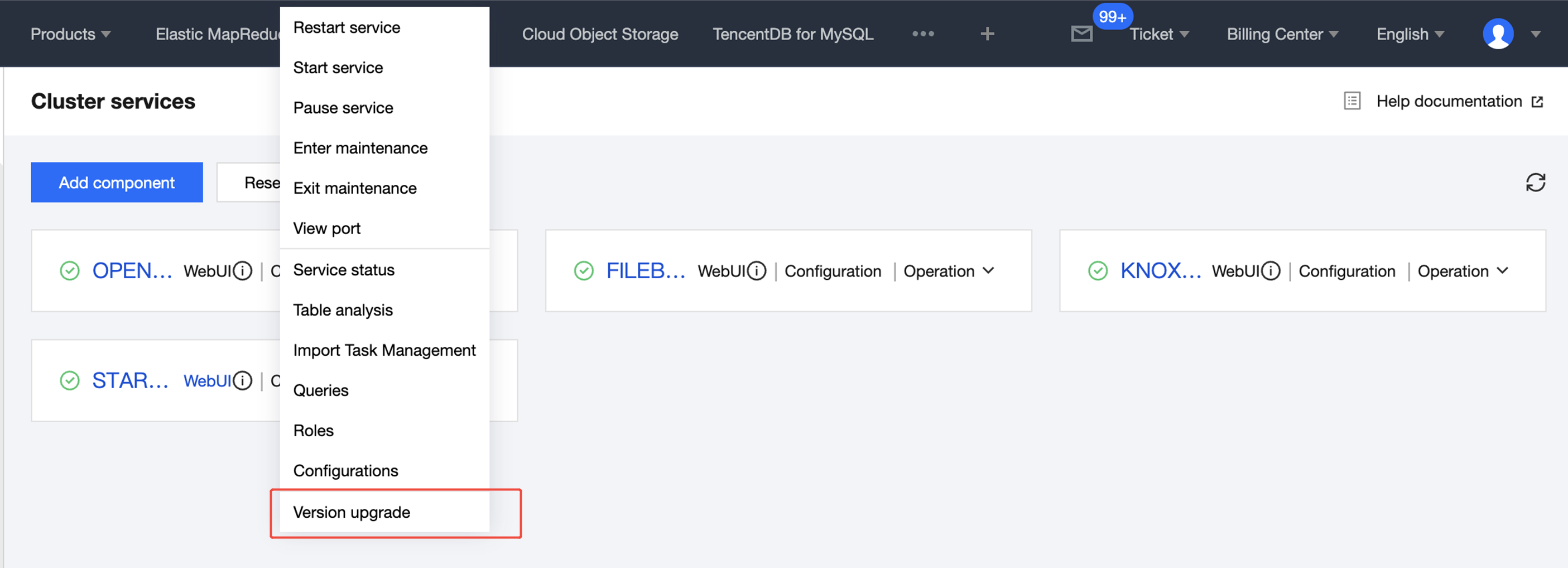 2. On the cluster details page, select Cluster Service and click Action > Version Upgrade at the top right corner of the corresponding component card parge.