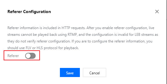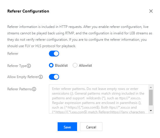 Informasi perujuk disertakan dalam permintaan HTTP. Oleh karena itu, konfigurasi perujuk tidak efektif untuk permintaan non-HTTP (seperti RTMP, WebRTC, QUIC). Jika Anda ingin membatasi akses permintaan RTMP agar pengguna yang berniat jahat tidak dapat melewati perlindungan hotlink perujuk melalui pull RTMP, silakan kirimkan tiket. Pengaktifan, penonaktifan, atau modifikasi perujuk akan diterapkan dalam waktu 15‒20 menit setelah konfigurasi. Anda tidak perlu melakukan push pada streaming lagi.