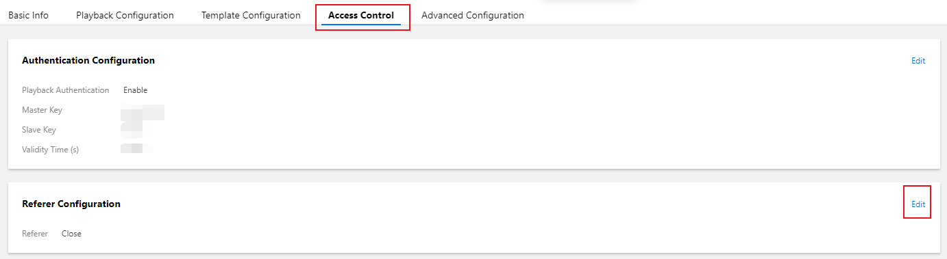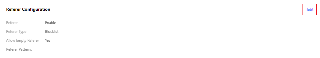 1. Pilih Domain Management (Manajemen Domain), lalu klik playback domain (domain pemutaran ulang) target atau klik Manage (Kelola) di sebelah kanan untuk masuk ke halaman manajemen domain. 2. Dalam Access Control > Referer Configuration (Kontrol Akses > Konfigurasi Perujuk), klik Edit untuk masuk ke halaman konfigurasi perujuk.