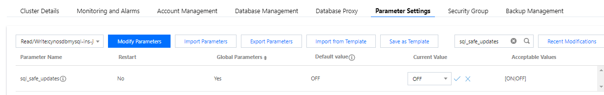 safe-updatesはデータベースの安全モードであり、アプリケーションのバグまたはデータベース管理者の誤操作により、テーブル全体に対する更新(update/delete)が発生する場合があります。TDSQL-C for MySQLでは、この操作を制限するsql_safe_updatesパラメータを提供しています。