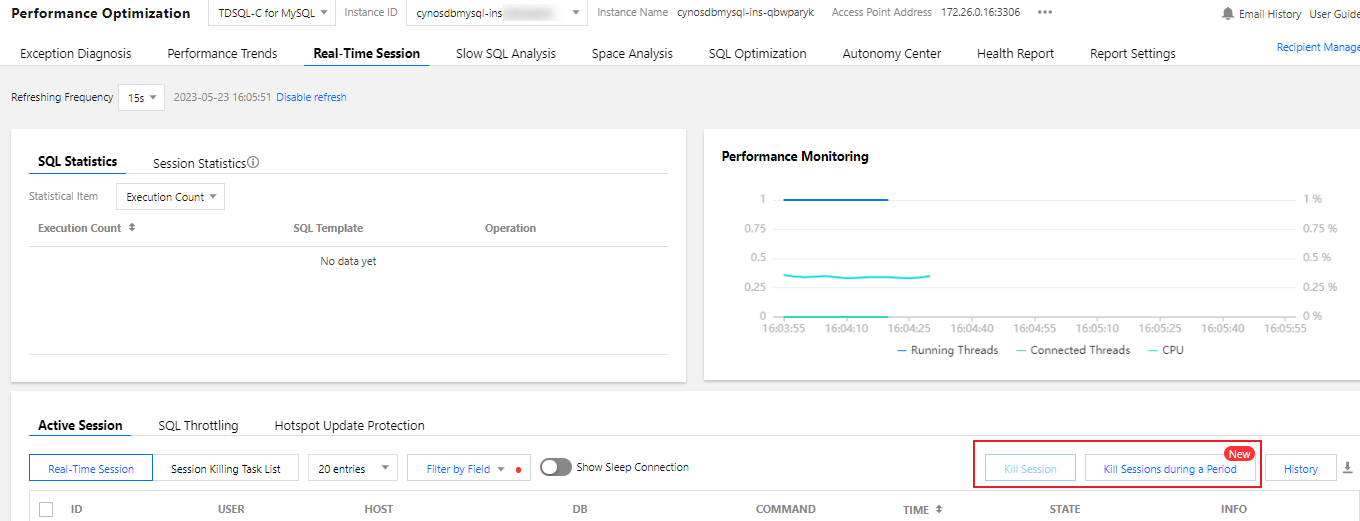 show processlistコマンドを実行するか、DBbrainのリアルタイムセッションを通じて、実行中のスレッドの詳細情報を確認できます。 Threads_createdスレッドデータが増加し続けていることが確認された場合、ビジネスの実際の状況に応じてKillコマンドで一部セッションを終了させるか、DBbrainのリアルタイムセッションにある「Killセッション」または「持続的Kill」操作で同様の処理を完了できます。