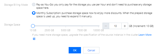 プロビジョニング済みリソースのインスタンス形態では、コンピュート仕様が年/月単位サブスクリプションを採用し、ストレージスペースが従量課金を採用する場合、ストレージスペースは実際の使用量に基づいて自動的にスケーリングされます。