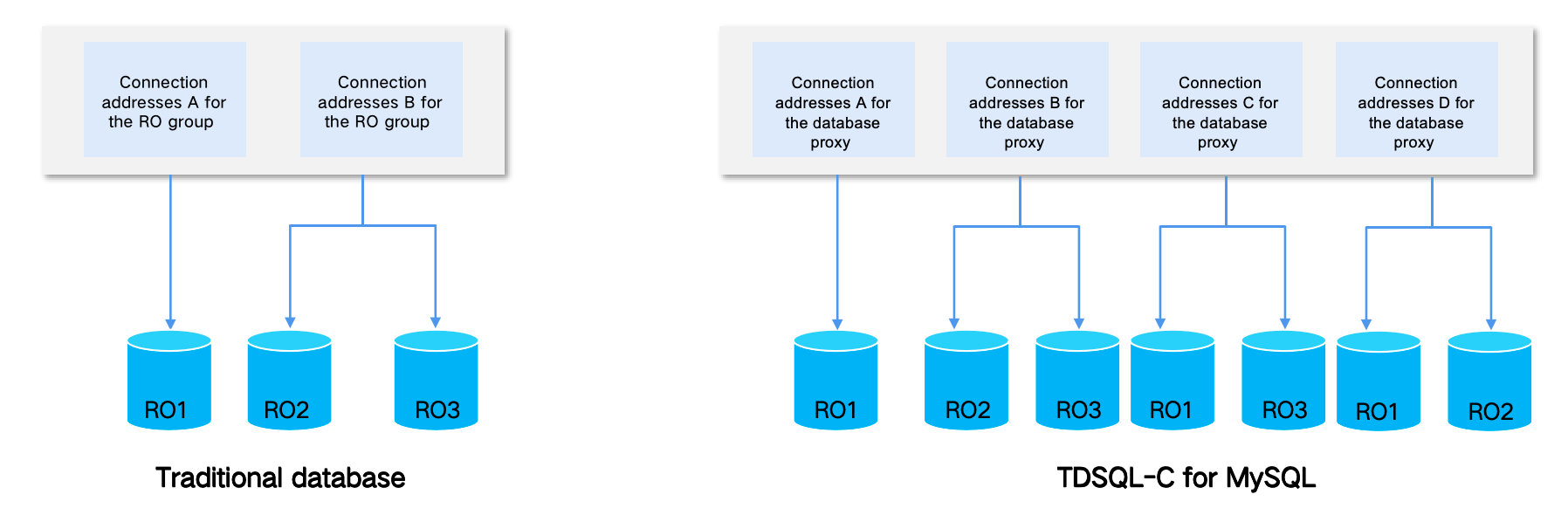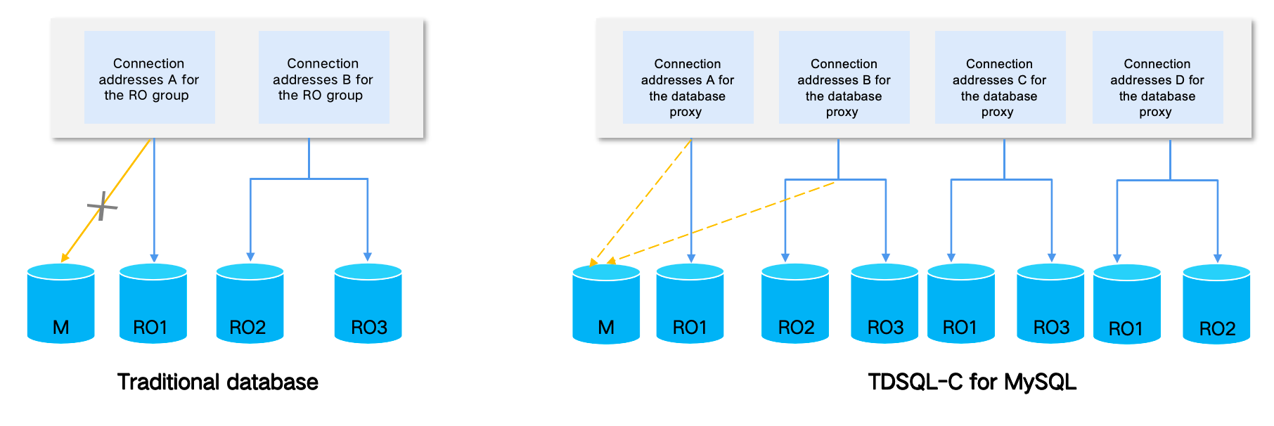 従来のデータベースでは、読み取り専用インスタンスROグループ内には読み取り専用インスタンスのみ接続可能で、マスターインスタンスは接続できません。一方、TDSQL-C for MySQLでは、各データベースプロキシアドレスの下にマスターインスタンスを接続可能です。データベースプロキシアドレスを通じて、マスターインスタンスと読み取り専用インスタンスへのトラフィック振り分けアクセスを実現できます。