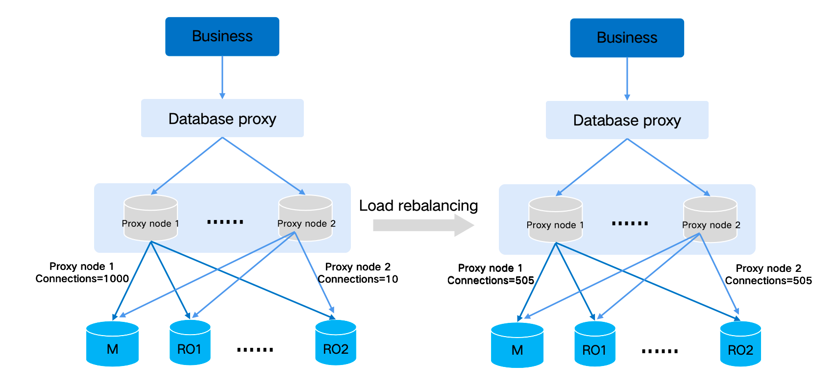 データベースプロキシを有効化した後、プロキシノードリストの接続数を確認するか、各プロキシノードのパフォーマンス監視を確認することで、各ノードでアクセス不均衡が発生していないか判断できます。ビジネスに大量のロングコネクションが存在する場合、データベースプロキシノードを追加しても新しいノードの負荷不均衡が発生する可能性があります。各プロキシノードの接続数に不均衡が見られる場合は、再CLBを実行し接続を分散させることが可能です。