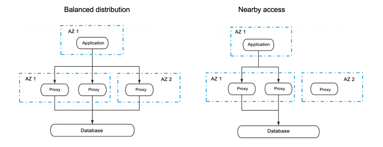 接続モードの設定により、アプリケーションまたはクライアントとデータベースプロキシ間の接続リンクを制御できます。均等分散と近接接続の2つのモードがあります。均等分散モードではトラフィックを均等に分散でき、単一ノードの負荷過多が発生しません。近接接続モードでは、アプリケーションは同一アベイラビリティーゾーンまたはアクセスパスが最短のデータベースプロキシノードに接続します。データベースプロキシに複数のアベイラビリティーゾーンノードが存在する場合でも、アプリケーションはアクセスパスが最短のデータベースプロキシノードを選択して接続するため、アクセス遅延が低く高速であるというメリットがあります。