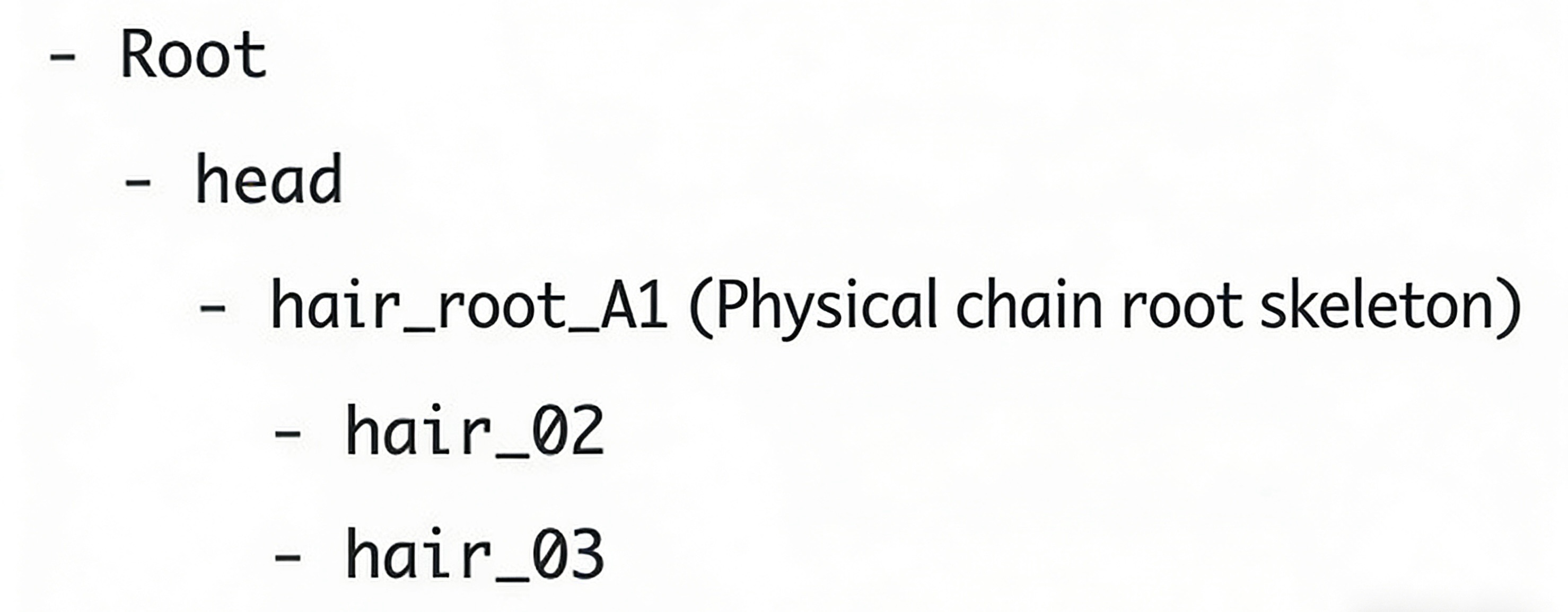 物理計算が必要なボーンは物理チェーンの起点となるボーン(Rootの子)で、ルートボーン名は数字やABC+数字で命名可能です。物理設定の利便性を考慮しています。