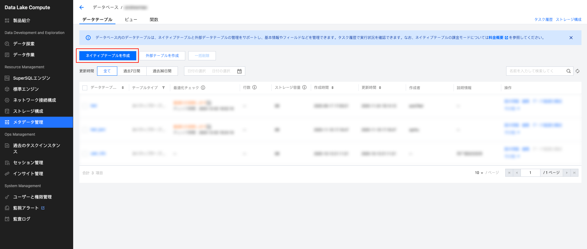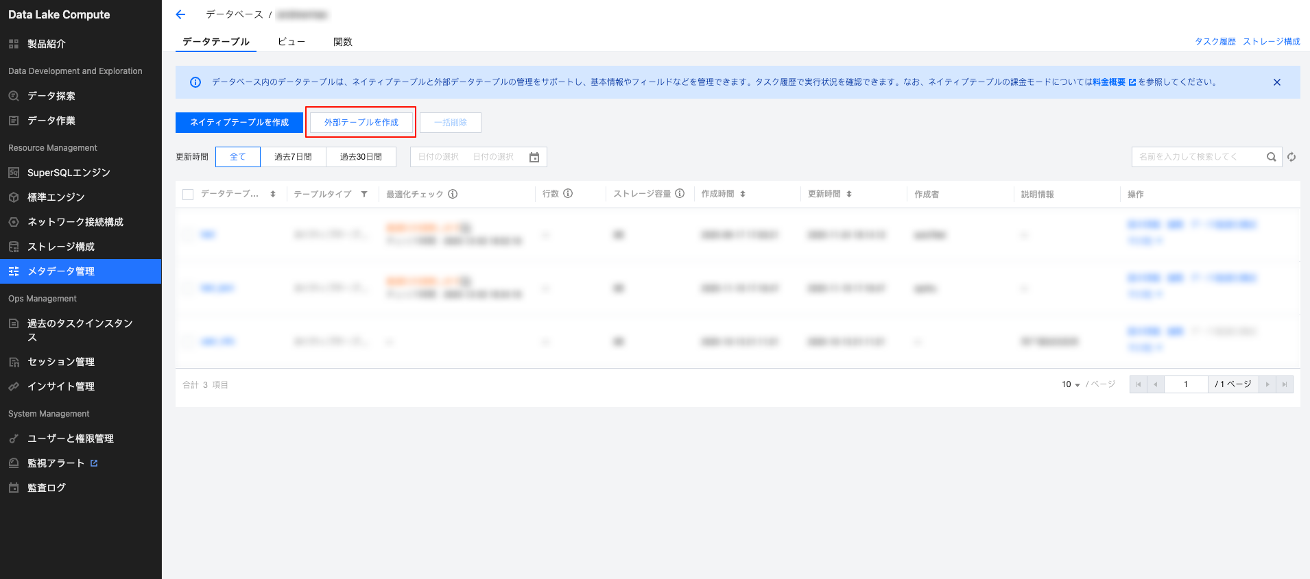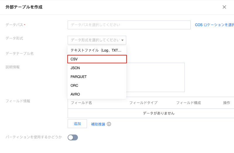 /**LOCATION: 対応するcosストレージディレクトリを指しますその他の部分はそのまま保持します*/CREATE EXTERNAL TABLE dlc_db.orc_demo_with_complex_type(col_bigint bigint COMMENT 'id number',col_int int,col_struct struct<x: double, y: double>,col_array array<struct<x: double, y: double>>,col_map map<struct<x: int>, struct<a: int>>,col_decimal DECIMAL(10,2),col_float FLOAT,col_double DOUBLE,col_string STRING,col_boolean BOOLEAN,col_date DATE,col_timestamp TIMESTAMP)PARTITIONED BY (`dt` string)STORED AS ORC LOCATION 'cosn://your_cos_location';