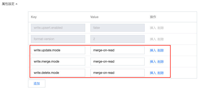 write.update.mode | 更新モード | デフォルトはコピーオンライトです デフォルトはcopy-on-writeモードです。2つのモードが不明確な場合は、copy-on-writeモードを使用してください。merge-on-readは行レベルの更新シナリオに大きな最適化があります。 コピーオンライトの適応シナリオ:クエリ性能が比較的速く、書き込みが比較的遅いため、定期的なETLタスクや大量データのバッチ更新操作シーンに適しています。 merge-on-readの適応シナリオ:クエリ性能はやや遅めですが、書き込みはより高速で、書き込み性能が求められる場面に適しています。行単位の更新能力に優れており、頻繁な小範囲(10%未満)のmerge into/update/deleteやOceanus(Flinkストリーム書き込みシナリオ)での書き込み性能が大幅に向上します。 |