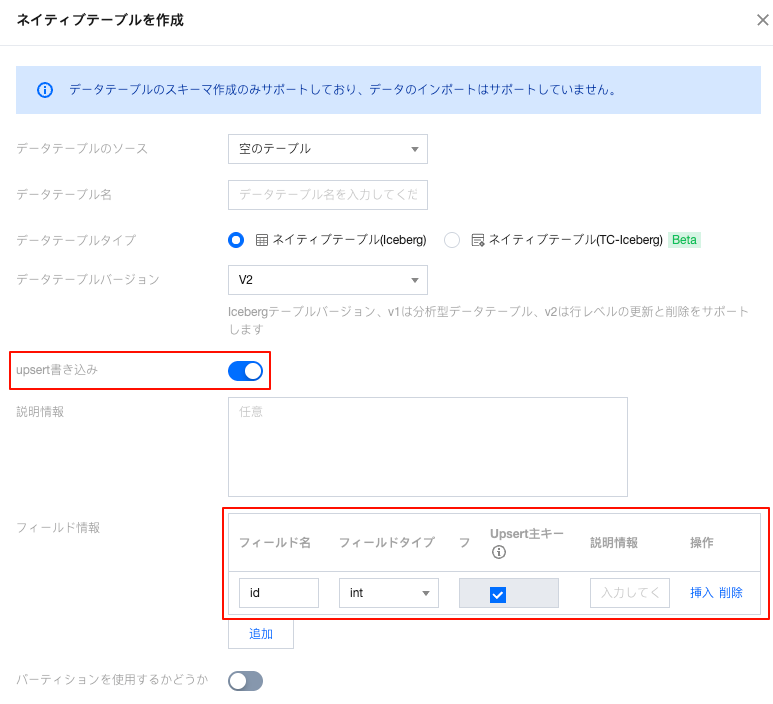 write.upsert.enabled | upsertをオンにするかどうか、値はtrueです。設定しない場合はオフになります。 | ユーザーの書き込みシナリオにupsertがある場合、trueに設定する必要があります。 |