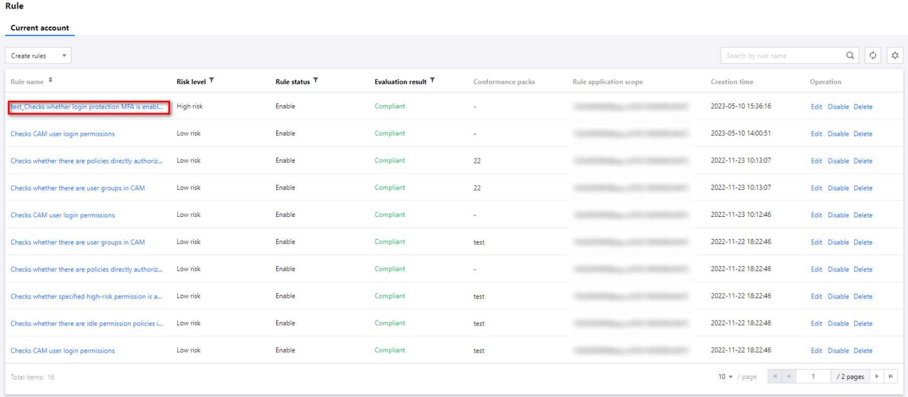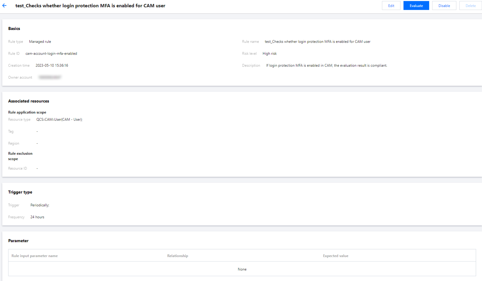 の詳細情報を確認できます。ルール詳細では、ルールの基本属性、関連リソース、トリガーメカニズム、パラメータ構成、および評価結果が表示されます。詳細ページでルールの編集、手動評価、有効化/無効化、削除などの操作を実行できます。