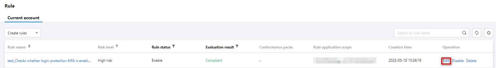 ルールリストで編集が必要なルールを見つけ、操作列の