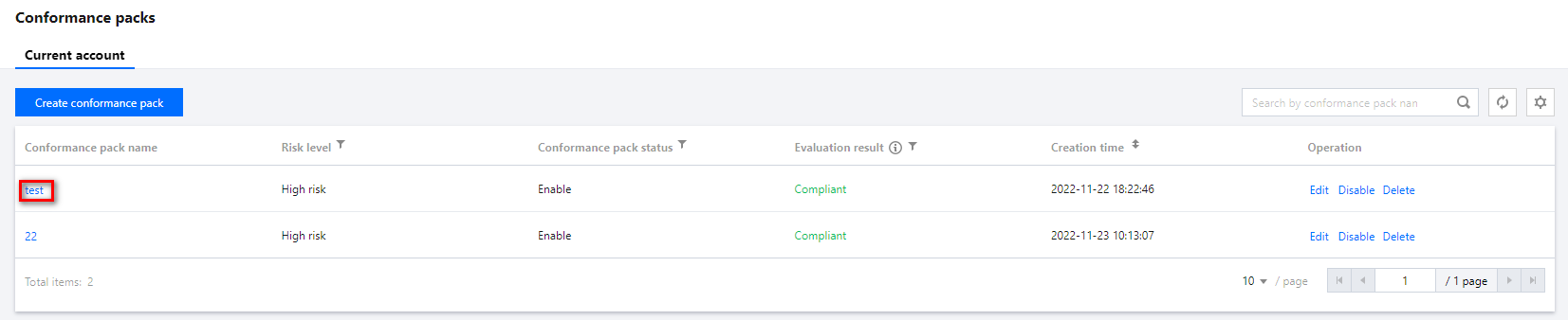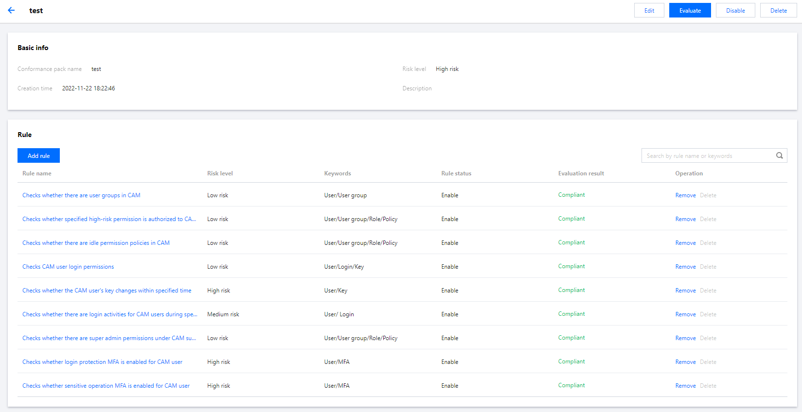 では、コンプライアンスパッケージの基本属性、含まれるルール、およびルール評価結果が表示されます。詳細ページでは、