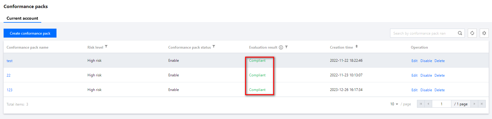 で各コンプライアンスパッケージの評価結果を確認できます。コンプライアンスパッケージ内のすべてのルールがコンプライアンスと評価された場合、コンプライアンスパッケージの評価結果はコンプライアンスとなります。そうでなければ、非コンプライアンスとなります。