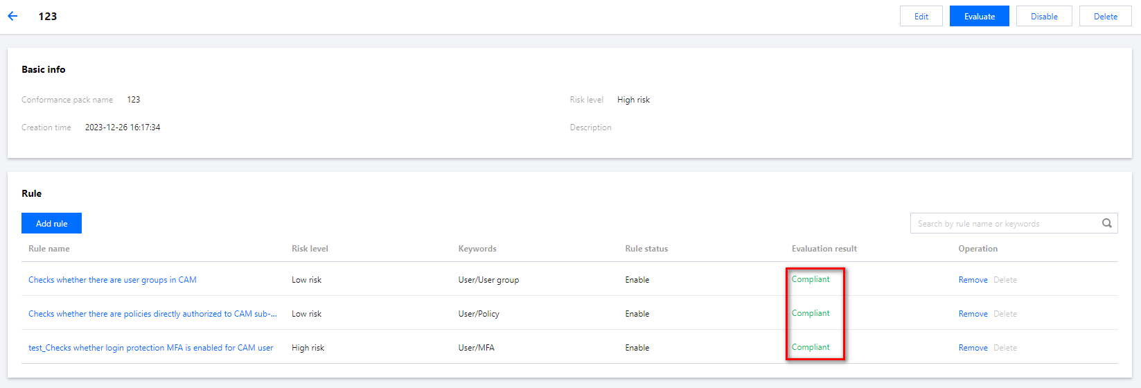 コンプライアンスパッケージ内の各ルールの評価結果を確認する必要がある場合、コンプライアンスパッケージ名をクリックして、