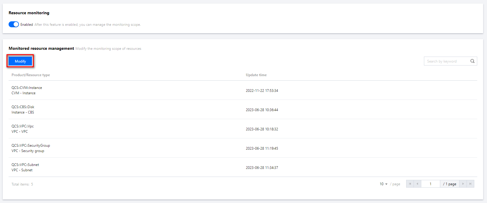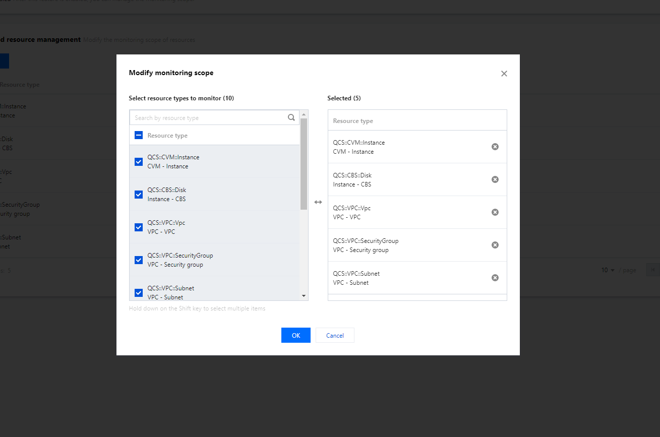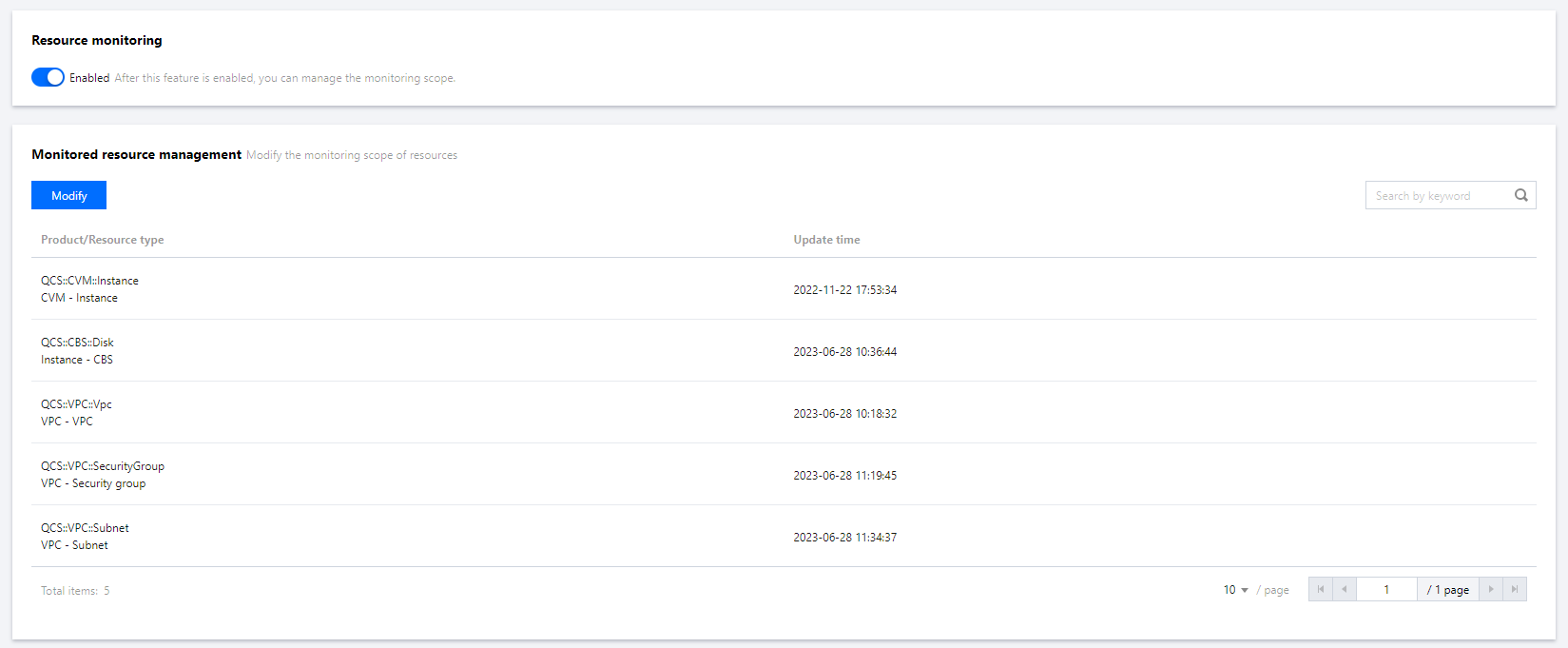 リソース監視ページでConfigを有効化できます。初めてConfigサービスを利用開始する場合、Configサービスに関連するロール(Config_QCSLinkedRoleInConfigRecorder)の作成を承認し、監視対象のリソースタイプを選択する必要があります。現在Configがサポートしているリソースタイプについては、サポートされているリソースタイプを参照してください。 Configを無効化する