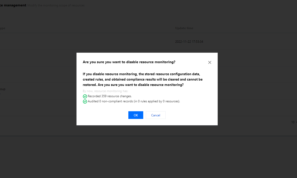 Configの使用が不要になった場合、リソース監視ページでConfigを無効化できます。無効化後、Configはリソース構成変更の監視と更新を停止し、Configに保存されているリソース構成データ、作成済みのルール、および得られたコンプライアンス結果はすべて消去され、復元できなくなります。過去にCOSバケットに配信されたデータは影響を受けません。