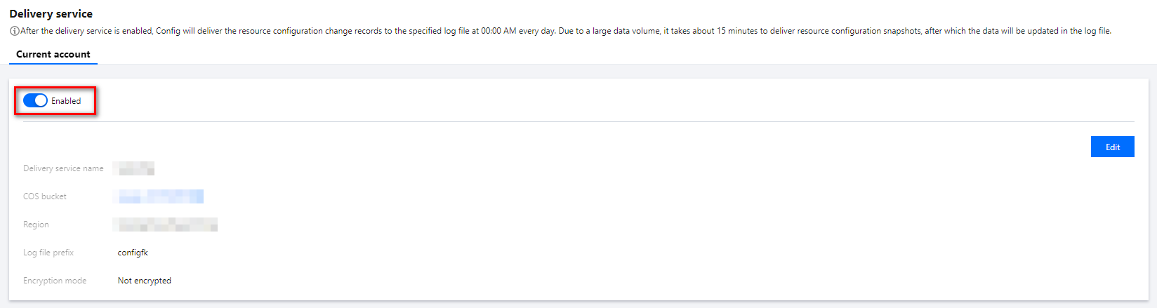 配信サービスを有効にした後、タイムラインが更新されると、設定監査は毎日00:00に指定したCOSストレージバケットにリソース構成変更履歴を配信します。無効化にすると、タイムラインの更新は対応するストレージバケットに保存されません。 データ量が多いため、リソース構成スナップショットの取得とCOSストレージバケットへの配信には10分間のウィンドウ期間があり、COSストレージバケットに配信されるデータの更新に一定の遅延が生じます。待ってください。