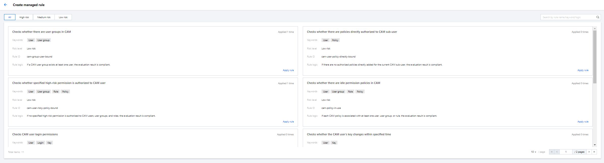 ユーザーがコンプライアンスパッケージを新規作成または編集する際に、ソースとしてルールリスト内の既存コンプライアンスパッケージに追加済みのルール、コンプライアンスパッケージテンプレート内のマネージドルール、またはマネージドルール内のマネージドルールを選択した場合、保存後にシステムは対応してユーザー向けに新しいルールを複製し、現在のコンプライアンスパッケージに追加します。