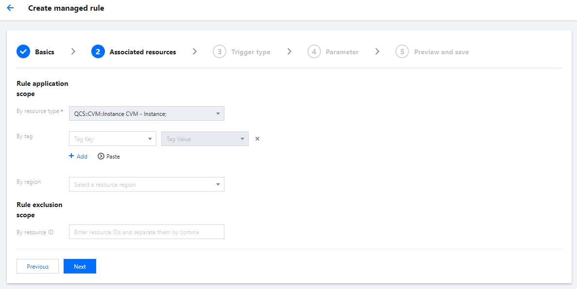 5. 関連リソースページで、監査が必要なリソースを選択します。必要に応じてTagまたはリージョンで適用範囲を確認するように設定でき、またリソースIDで除外範囲を設定することもできます。次へをクリックします。