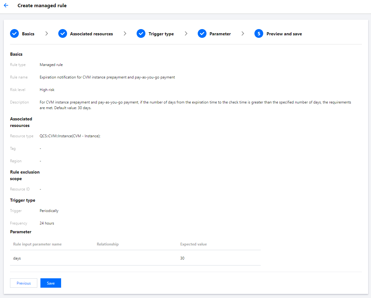 8. プレビューと保存ページで、作成されたルール情報を確認できます。必要に応じて前のステップに戻ることも可能です。問題がないことを確認した後、保存をクリックすると、正常に作成されます。