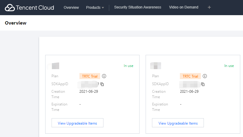 3. 애플리케이션 생성 후, 콘솔 전체보기 페이지에서 새로 생성된 애플리케이션의 상태, 서비스 버전, SDKAppID, 생성 시간, 태그 및 만료 시간을 확인할 수 있습니다. SDKAppID 정보를 저장하십시오.
