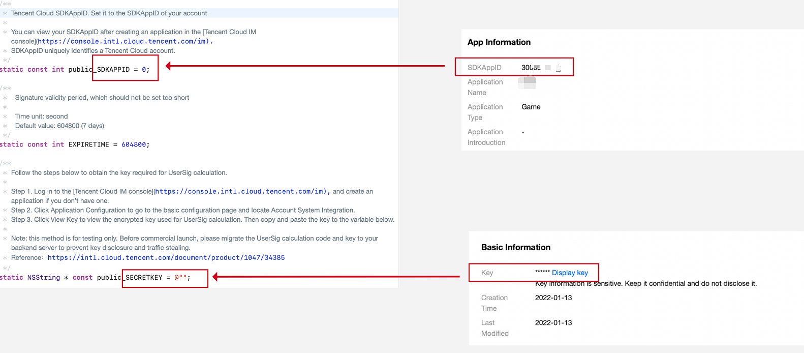 SDKAPPID: 1단계에서 획득한 실제 애플리케이션 SDKAppID로 설정합니다. SECRETKEY: 2단계에서 획득한 실제 키 정보로 설정합니다.