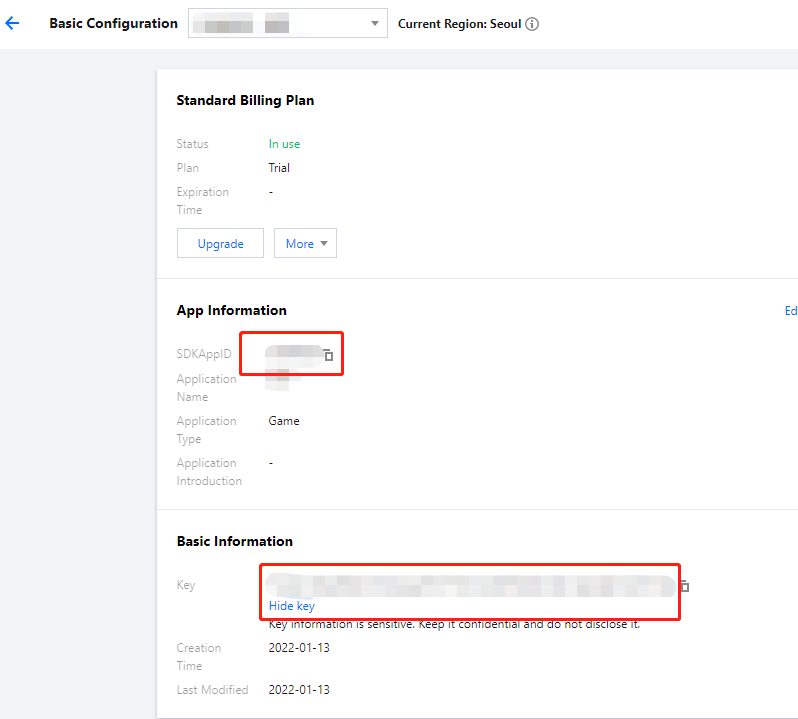 이미 애플리케이션이 있는 경우 SDKAppID를 기록하고 키 정보 가져오기를 합니다.