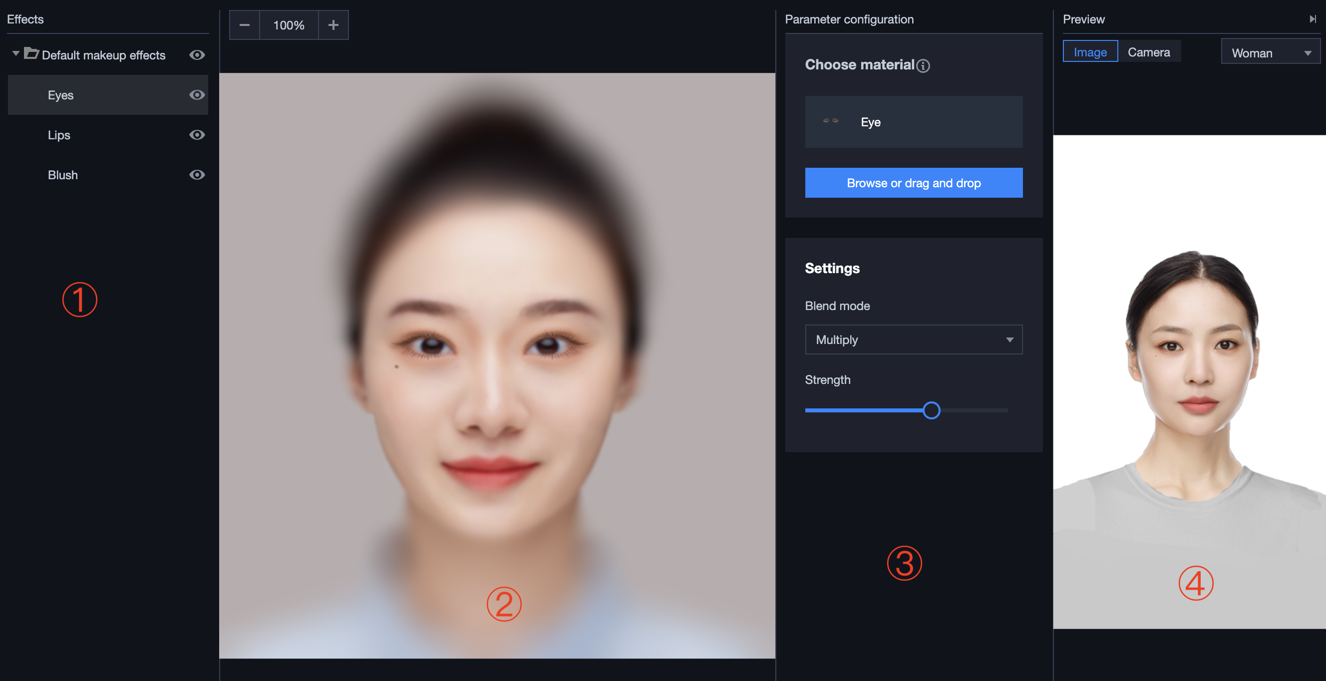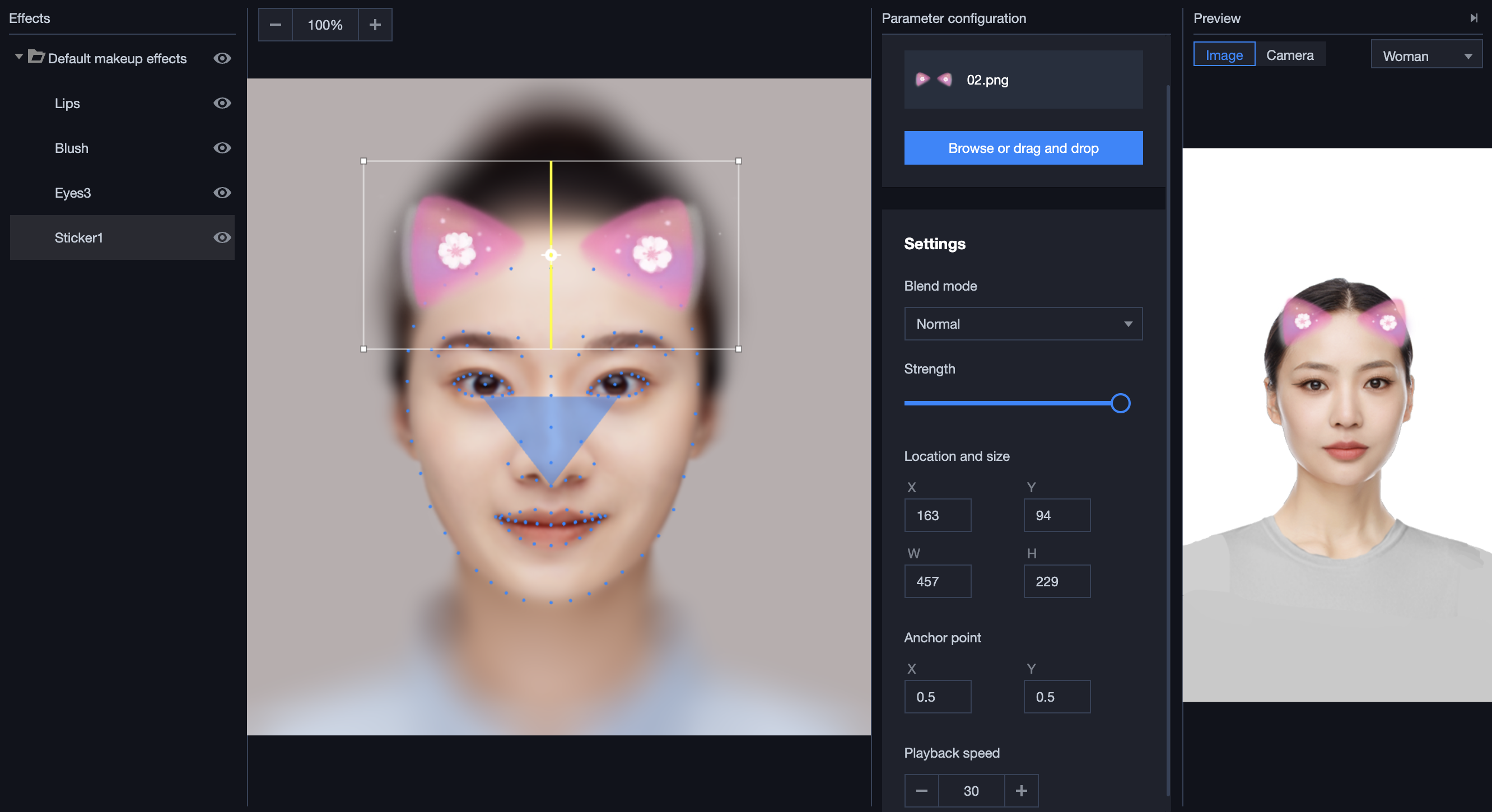 메인 패널에서 소재와 얼굴 추적 지점의 상대적 위치를 관찰하여, 얼굴 스티커 소재와 얼굴의 추적 표시 효과를 시각적으로 조정합니다.