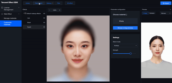1. 콘솔에 로그인하고 소재 제작으로 이동합니다. 기본 스티커를 추가하려면 상단의 얼굴 스티커를 클릭합니다.