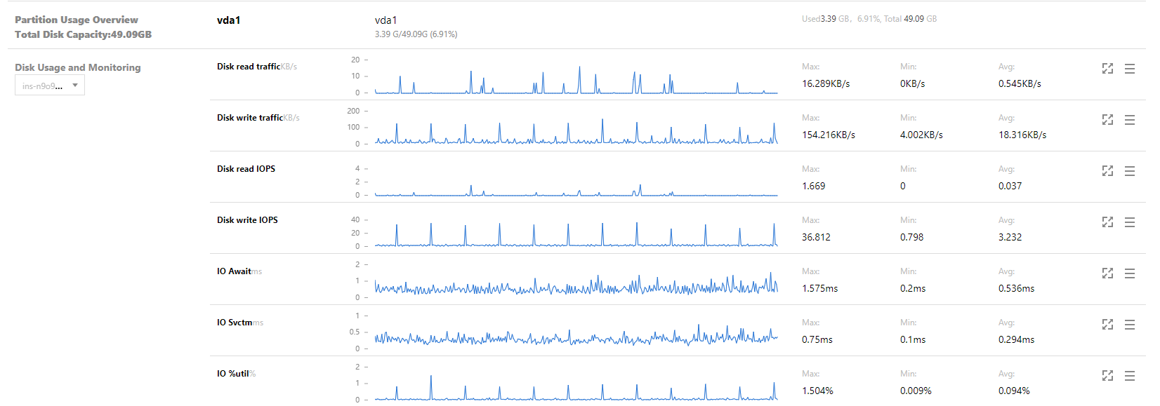3. 아래 이미지와 같이 인스턴스 상세 페이지에서 [모니터링] 탭을 선택하면 해당 인스턴스의 CBS 사용 현황을 확인할 수 있습니다.