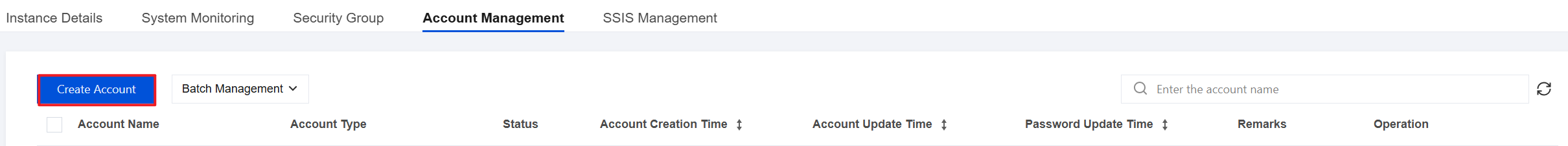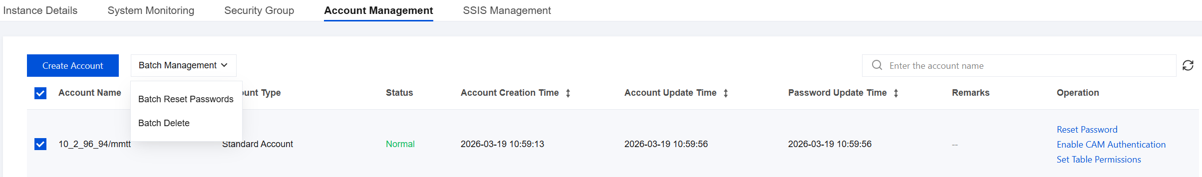 5. After successful creation, you can view the information of the new account on the Account Management tab, including account name, status, account creation time, account update time, password update time, and remarks. You can also perform operations on it, including Reset Password and Delete Account.