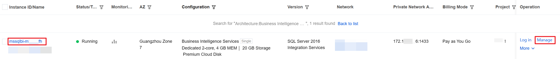 2. In the instance list, find the target business intelligence server and click its ID or Manage in the Operation column to enter the instance management page.