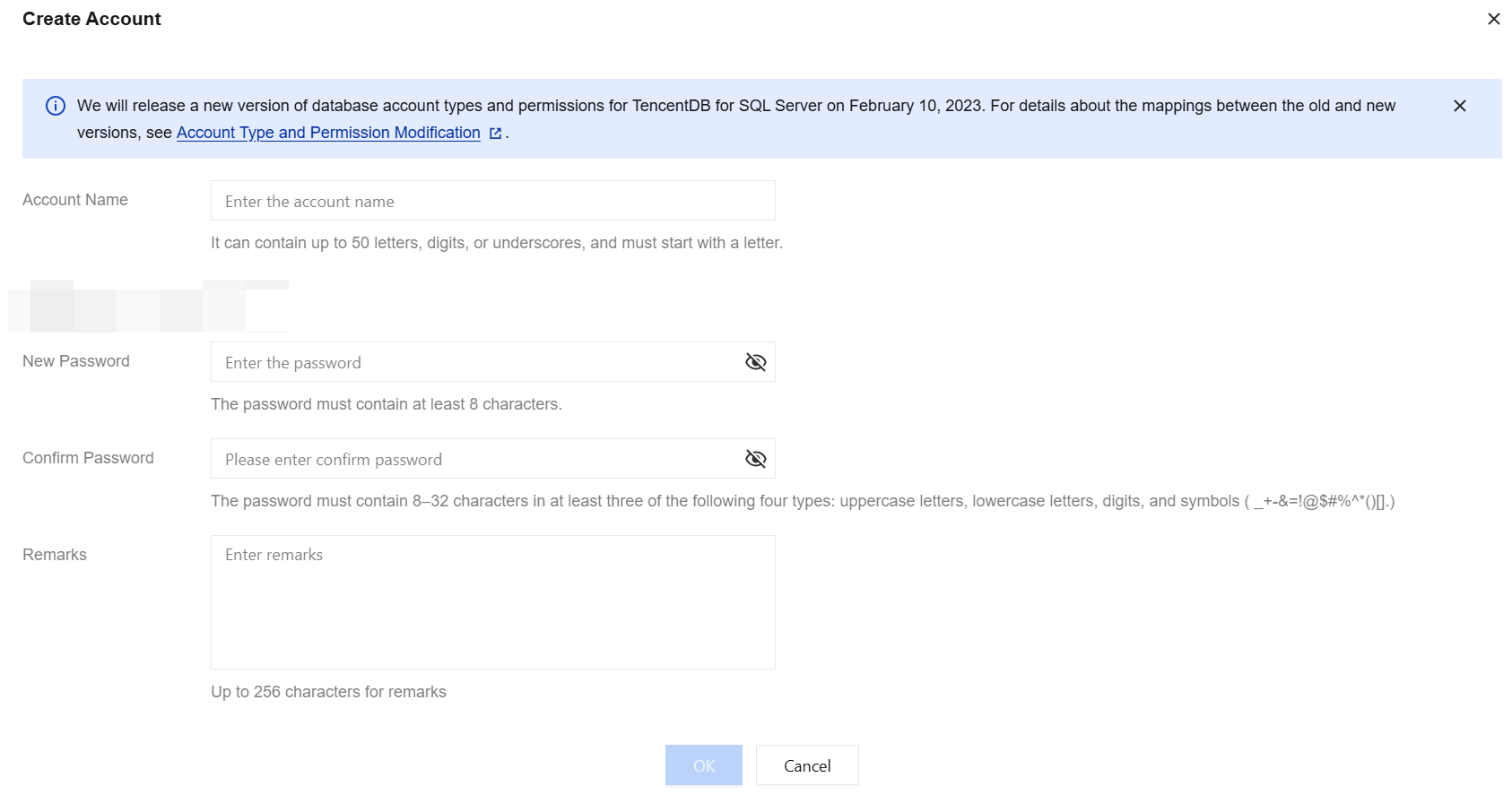 Account Name: It can contain 1–50 letters, digits, or underscores and must start with a letter.