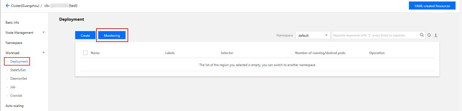 클러스터의 ID/이름을 선택하여 클러스터 관리 페이지로 이동합니다. 2. Workload>Any Workload Type을 선택합니다. 예를 들어 Deployment를 선택하여 Deployment 관리 페이지로 이동합니다.