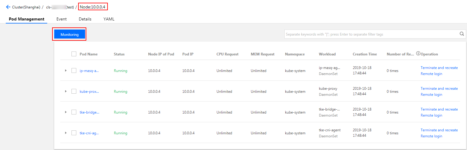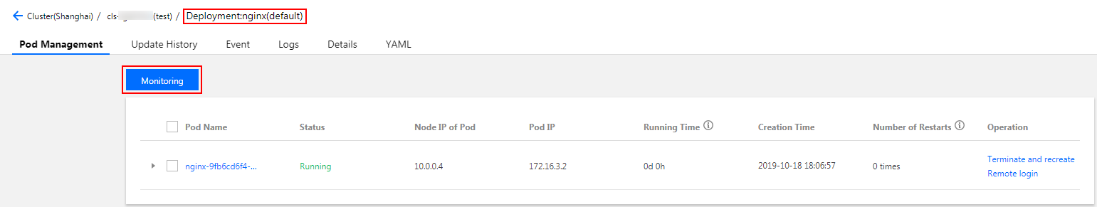 2. Pod Management 탭을 선택하고 Monitoring을 클릭하여 Pod Monitoring 페이지로 이동합니다.
