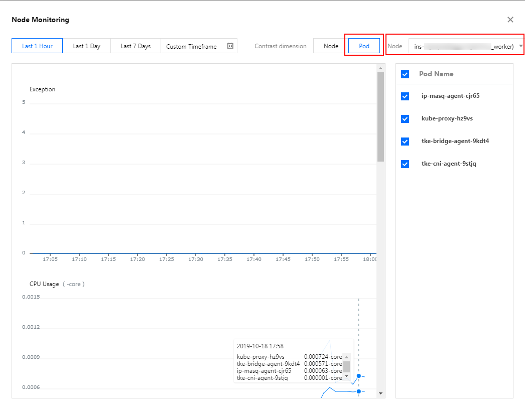 3.1.2 Pod를 클릭하고 확인할 노드로 Node를 선택합니다. 이렇게 하면 해당 노드의 Pod에 대해 모니터링되는 지표의 플롯을 확인할 수 있습니다. 아래 이미지를 참고하십시오.