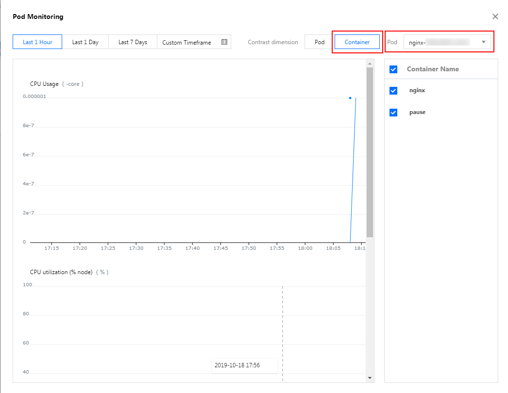 3. Container를 클릭하고 조회할 Pod로 Pod를 선택합니다. 이렇게 하면 해당 Pod의 Container에 대해 모니터링되는 지표의 플롯을 볼 수 있습니다. 아래 이미지를 참고하십시오.