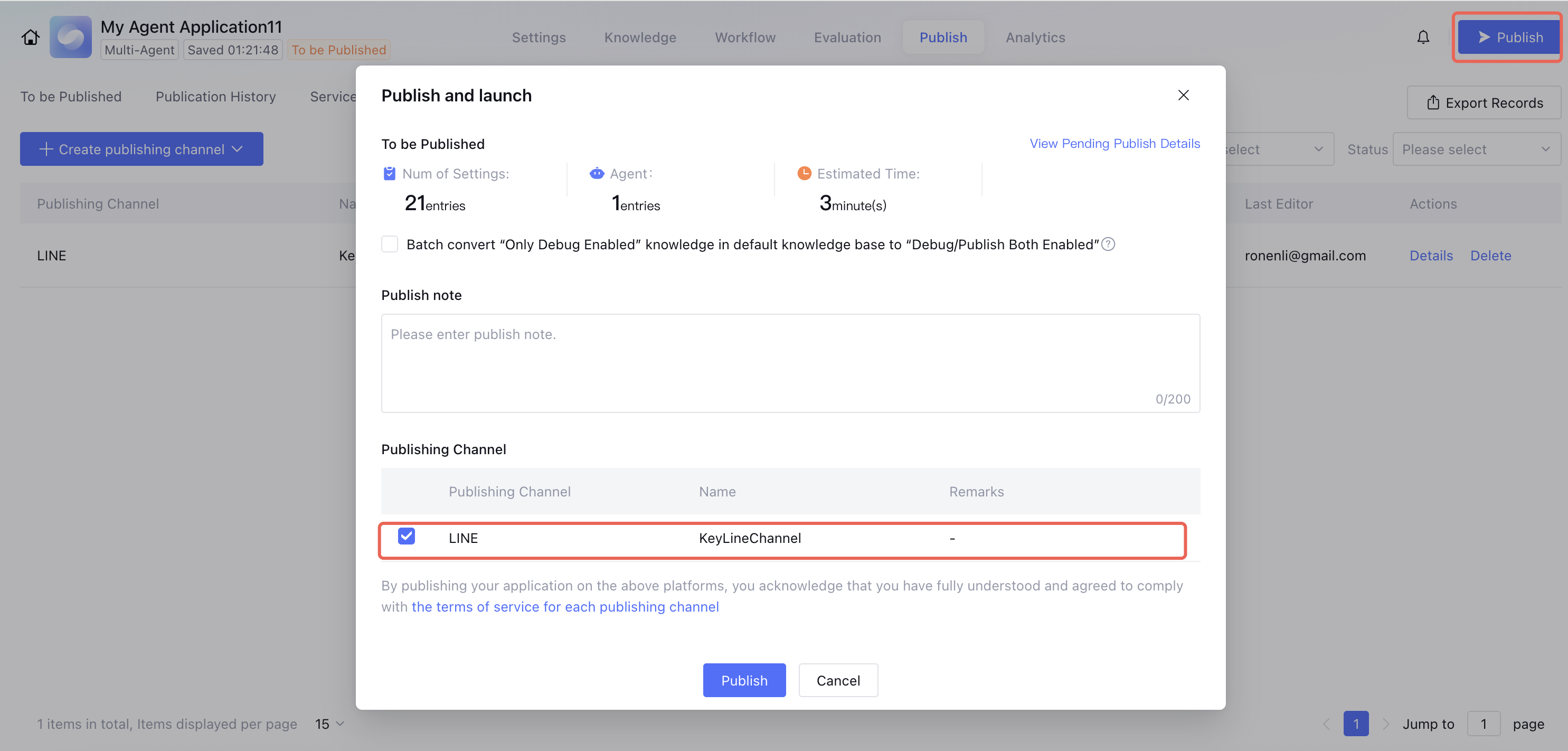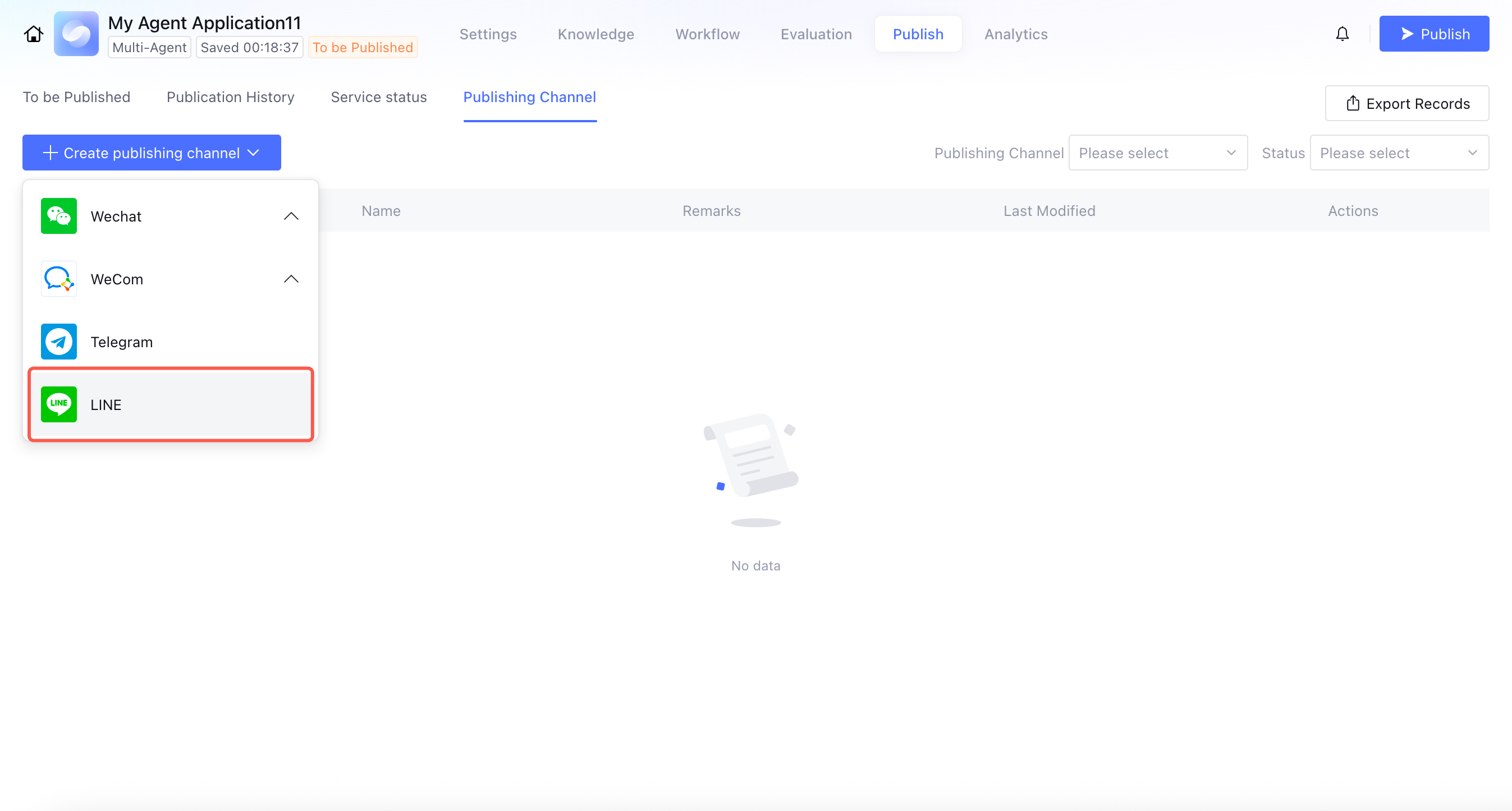 4. When publishing the application, select the LINE channel. After successful publication, you can access LINE to interact with the agent.