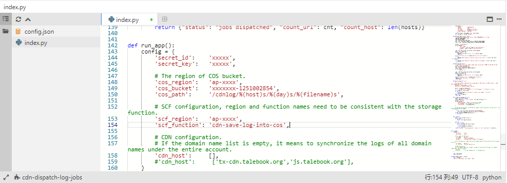 Defina os campos, como secret_id, secret_key, cos_region, cos_bucket e scf_region.